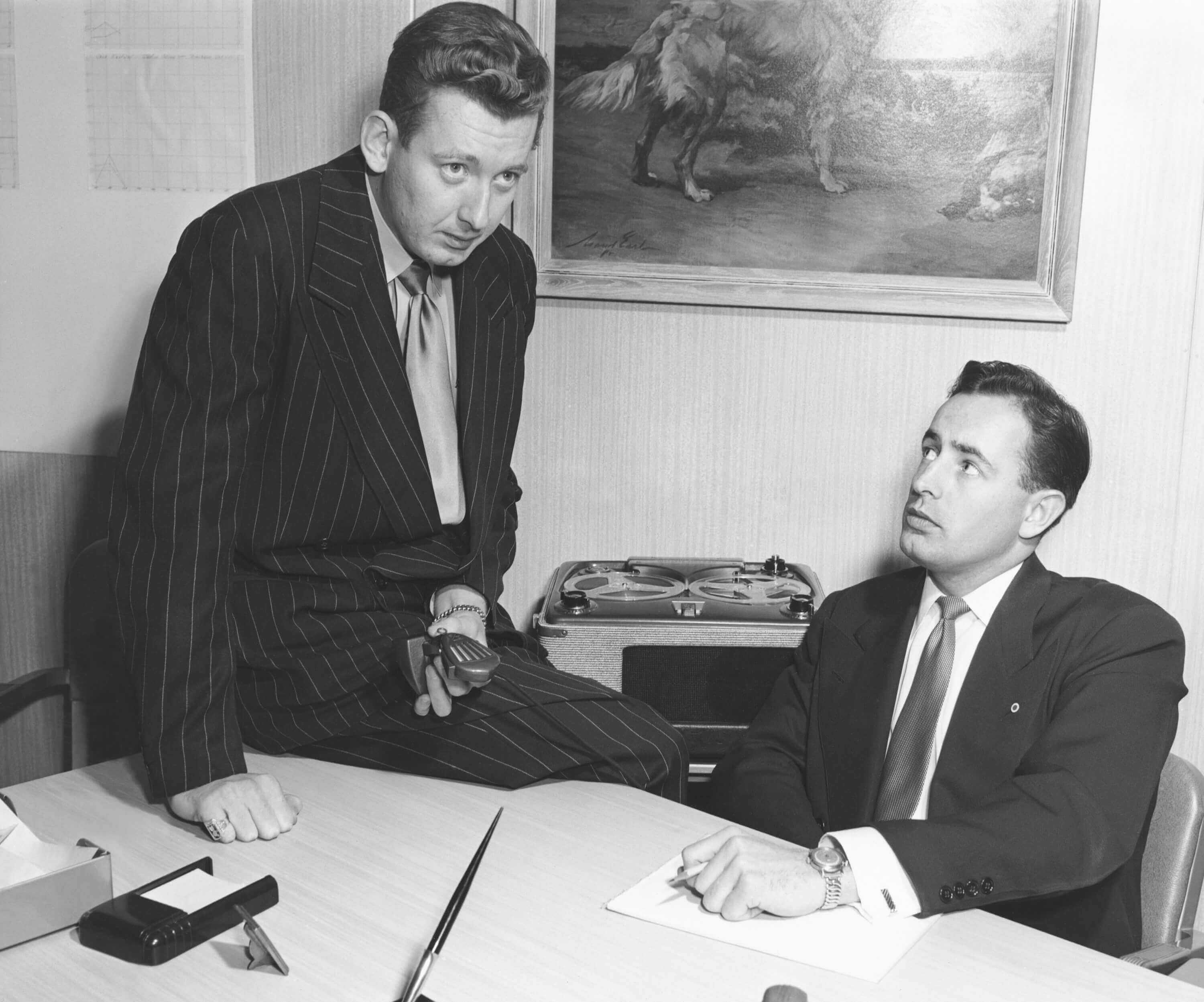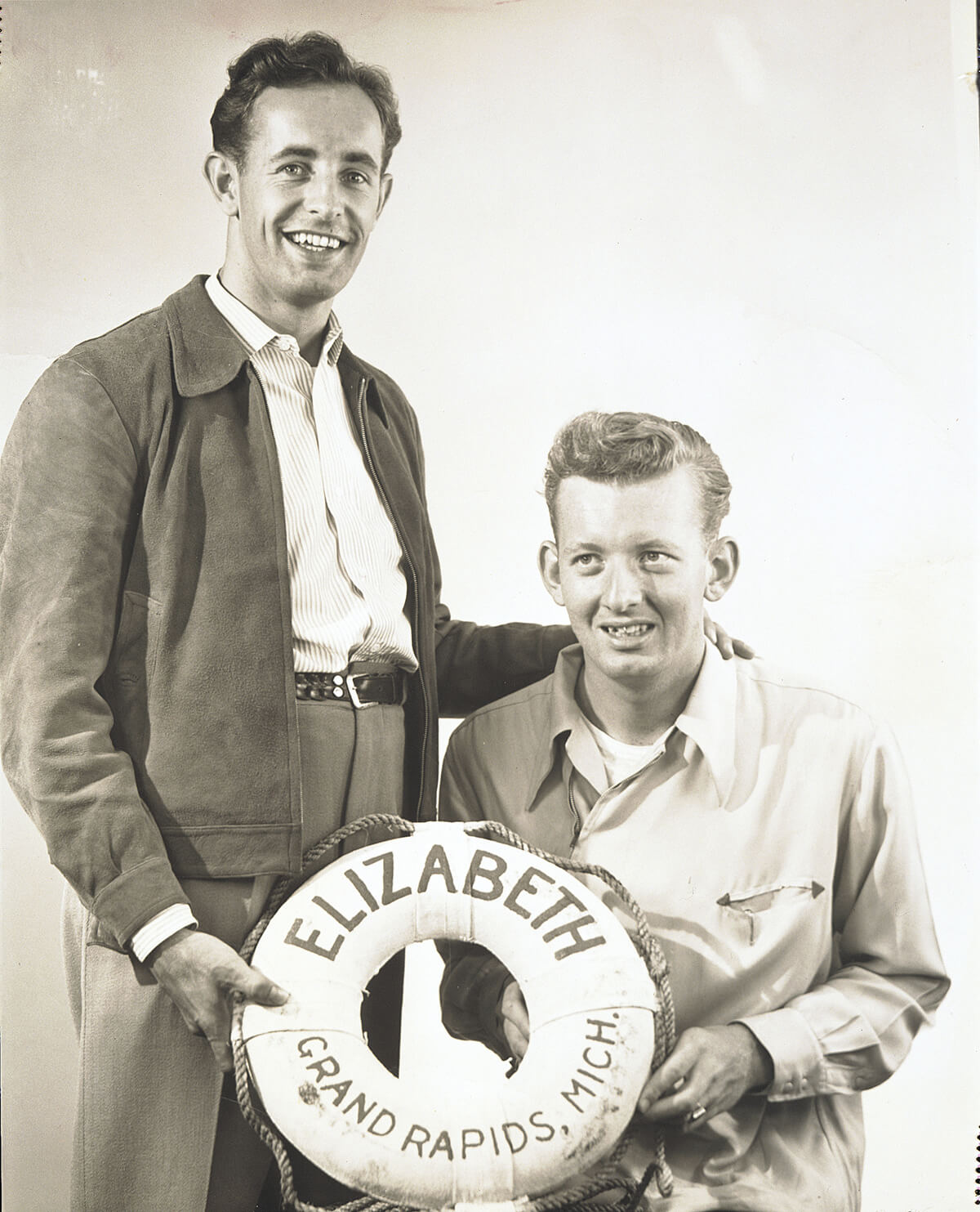 1949年,从南美回国后,理查·狄维士和杰·温安洛与从“伊丽莎白”号上抢救下来的救生圈合影