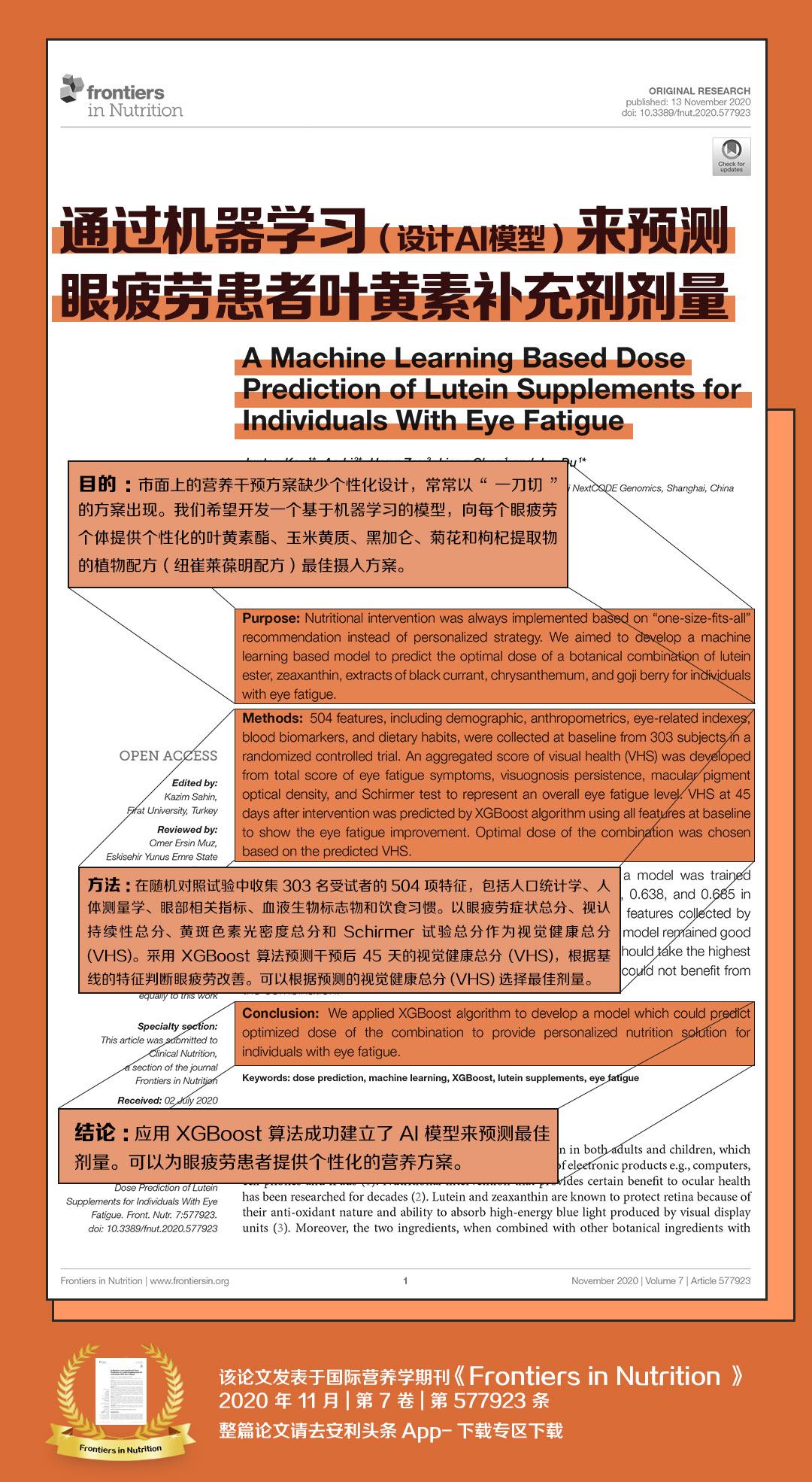 Kan J, Li A, Zou H, et al. A machine learning based dose prediction of lutein supplements for individuals with eye fatigue[J]. Frontiers in Nutrition, 2020, 7.