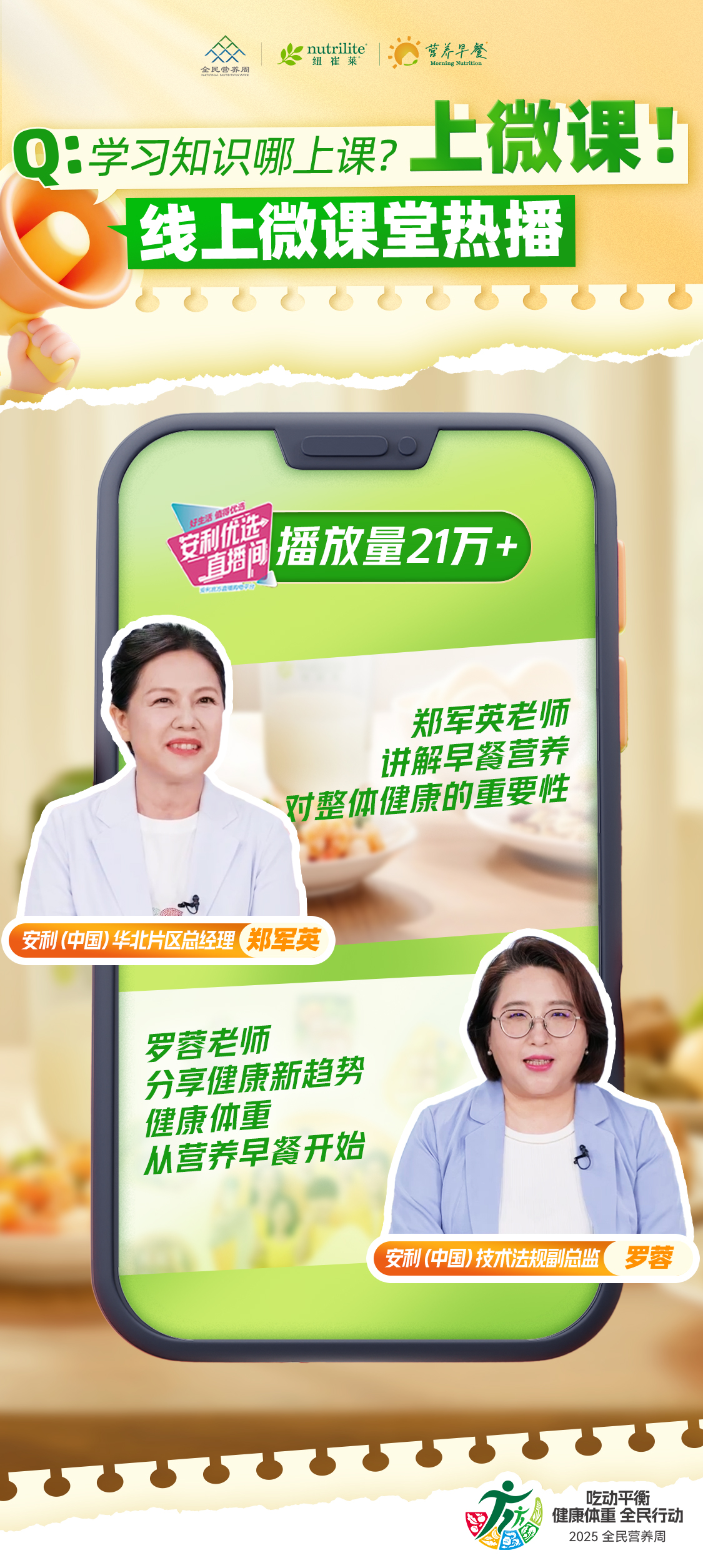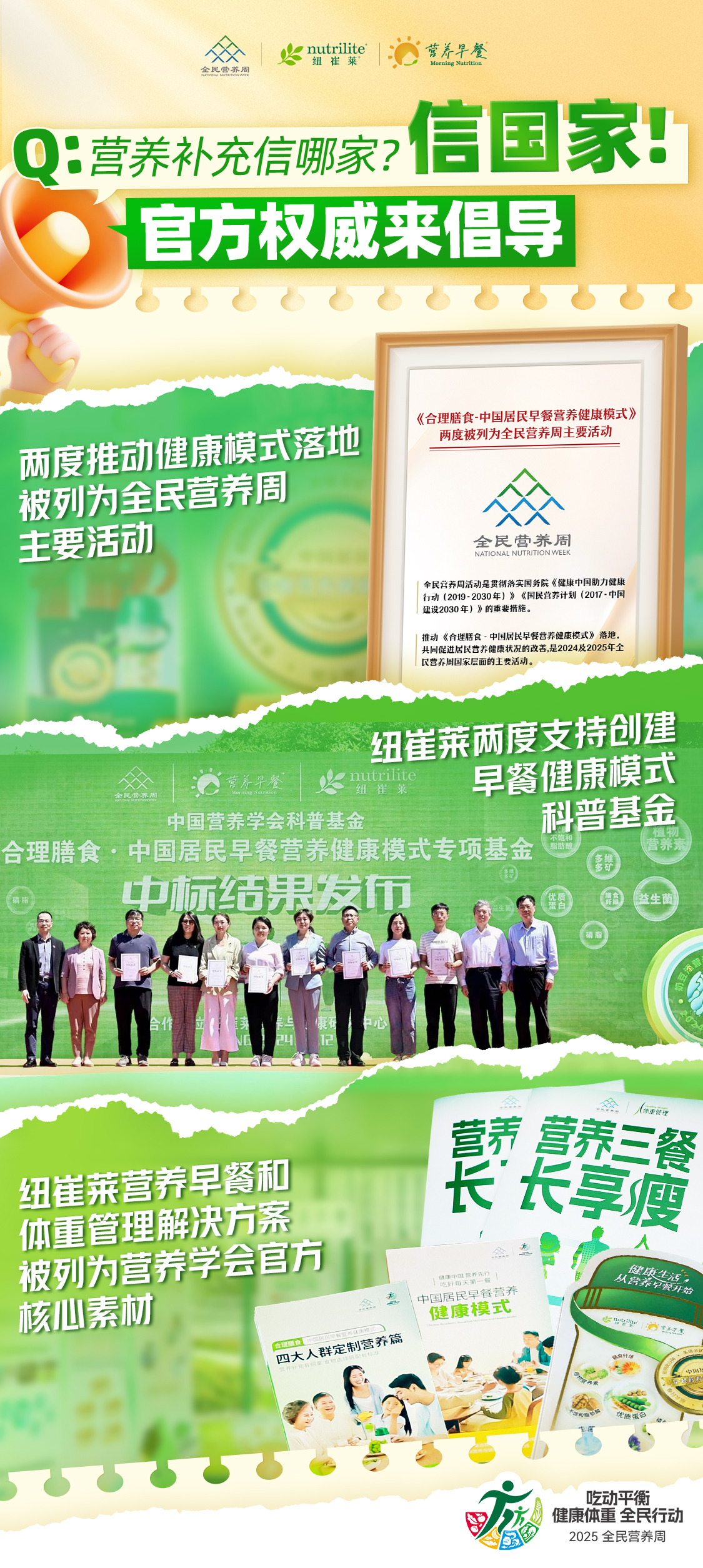 2025全民营养周火热进行中!两度获国家支持!权威护航更安心~ 专家明星齐助阵,科学掉秤有保障!线上微课随时学,实用知识轻松get!营养补充量身定,全家健康更圆满~ 多城联动齐参与,吃好早餐长享瘦!持续关注全民营养周主题活动,让我们一起行动,吃好营养早餐,健康体重咱们都能有!