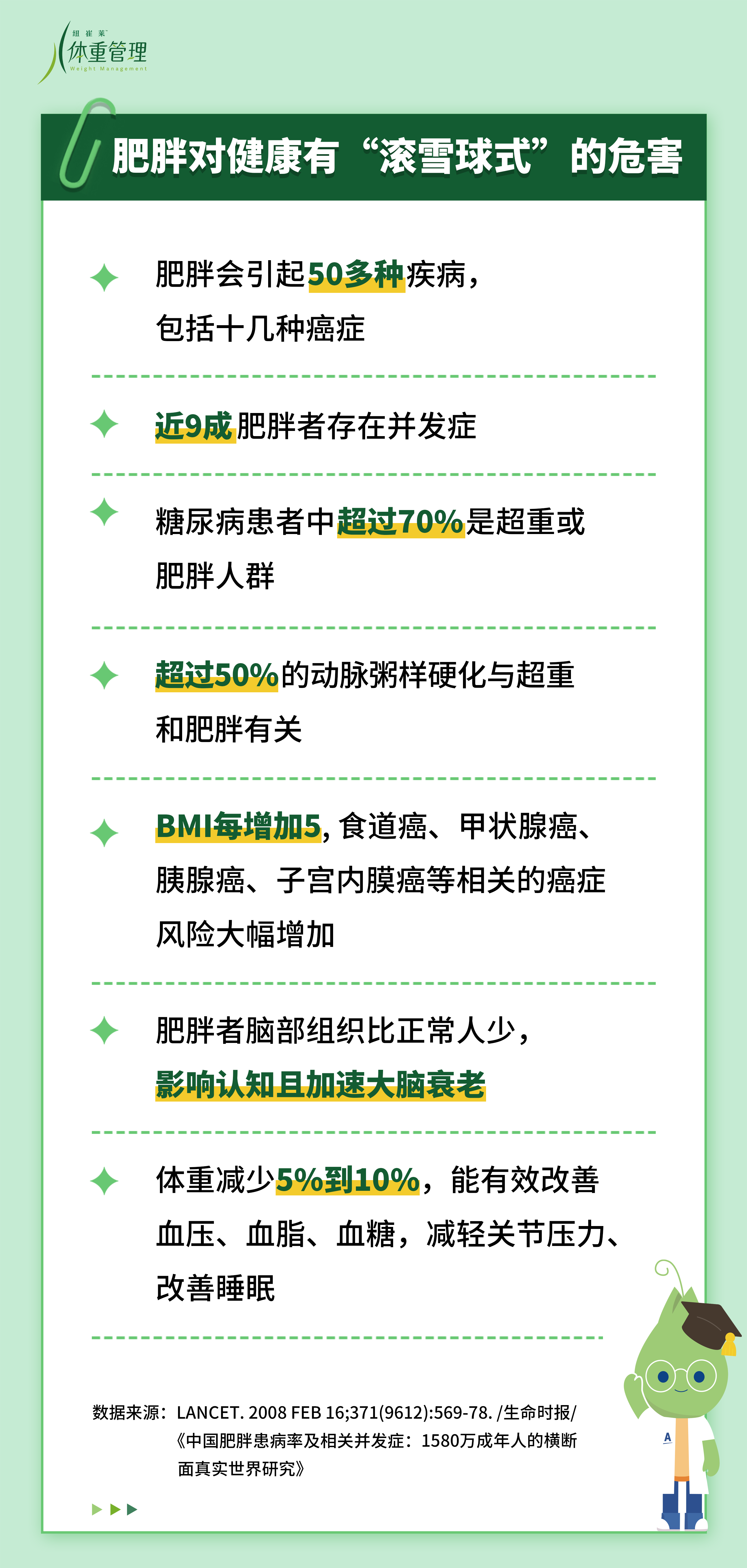 肥胖对健康的危害可以说是“滚雪球式”的,一旦出现肥胖,各种并发症就会接踵而来。研究发现肥胖会引起50多种疾病,包括十几种癌症。在肥胖人群中近9成存在并发症,其中常见的有脂肪肝、血脂异常、糖尿病、高血压、高尿酸血症、慢性肾病、胆结石、颈动脉斑块等。而这些疾病本身带来的影响及其治疗过程又可能加重肥胖,形成恶性循环 ³。