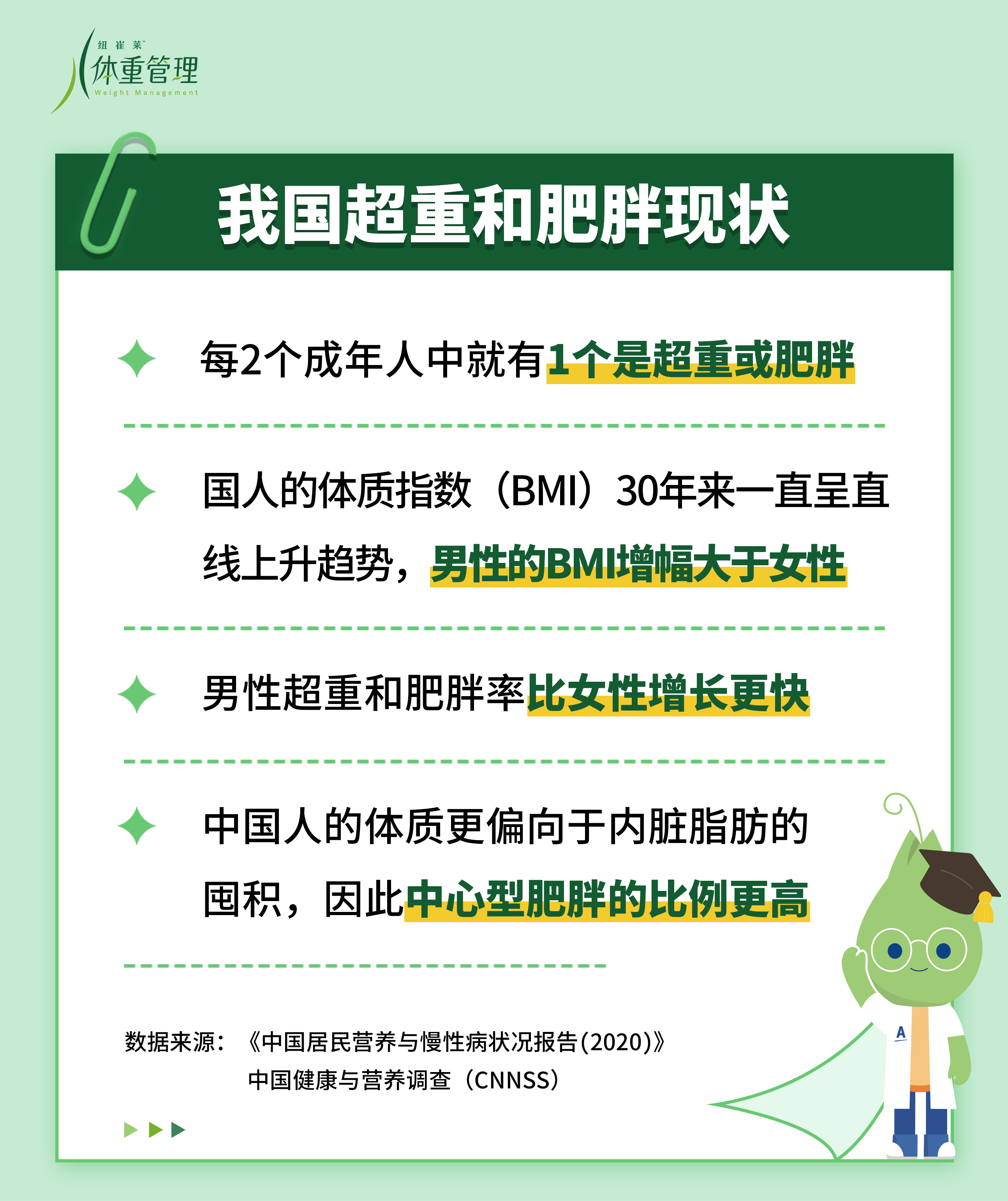 2020年的《中国居民营养与慢性病状况报告》数据显示:中国18岁及以上人群的超重比例为34.3%,肥胖比例为16.4%。也就是说每2个成年人中就有1个是超重或肥胖!按照绝对人口数来计算,中国已有6亿人超重或肥胖,人数在全球排名第一 ²。