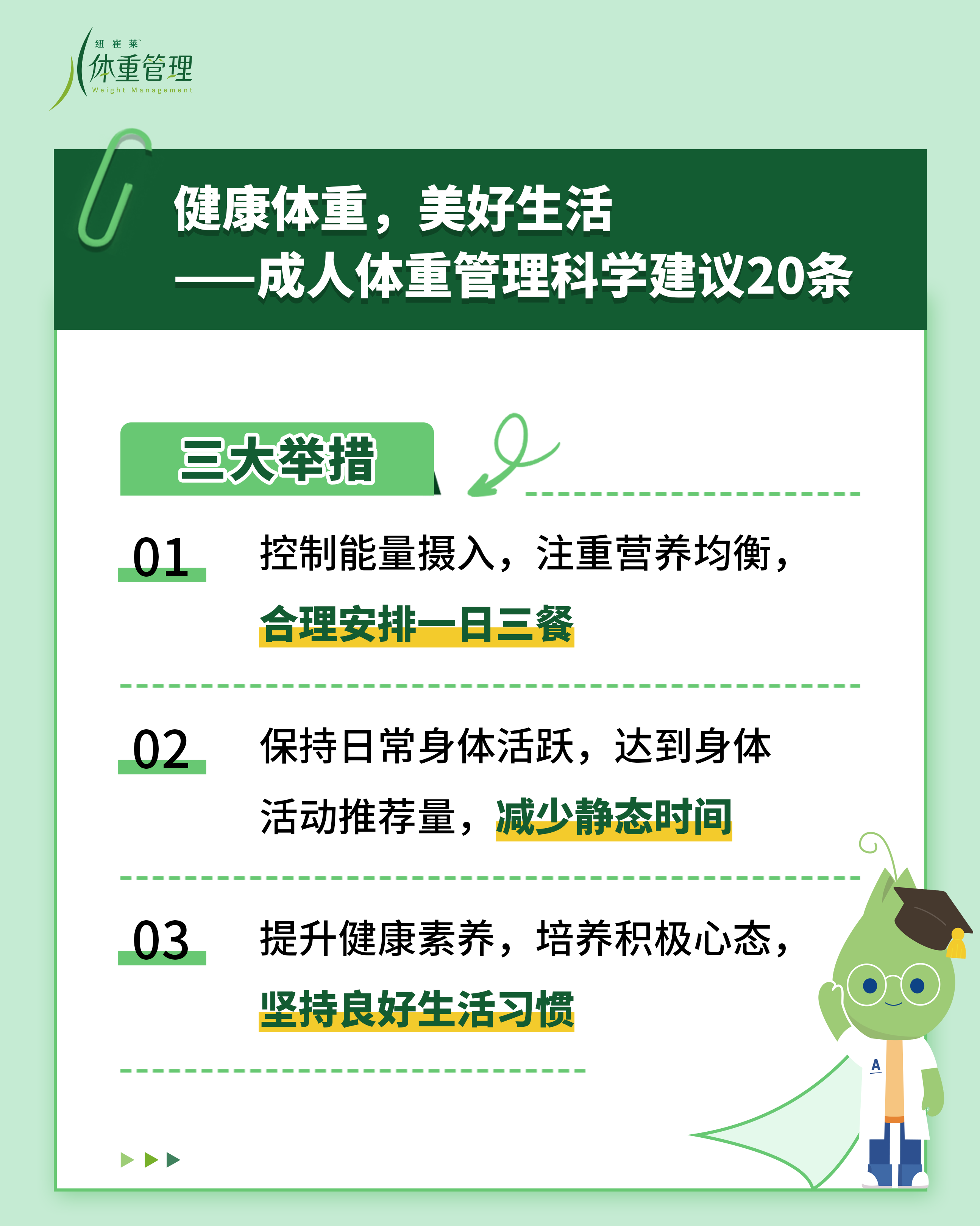 其实,科学的体重管理并不难哦。《健康体重,美好生活——成人体重管理科学建议20条》提出了体重管理的三大举措,并通过20条细致的指导,详细讲述了从如何吃、到如何运动、再到如何保持健康的生活方式,我们只要照着做就可以啦。