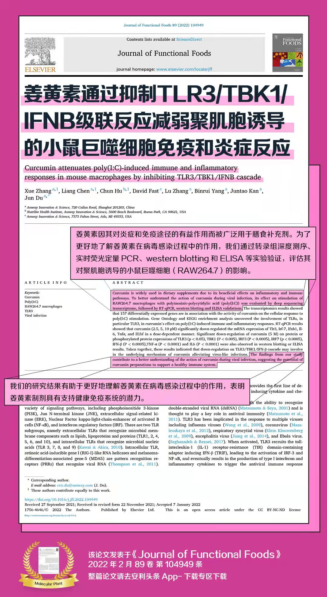 我们的研究结果有助于更好地理解姜黄素在病毒感染过程中的作用,表明姜黄素制剂具有支持健康免疫系统的潜力。