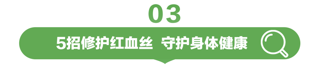 优质的睡眠可以促进身体自我修复,每日达到7-8小时的睡眠时间,皮肤能得到充分滋养,增强皮肤屏障功能,改善面部红血丝;同时让眼部、腿部等部位血管放松,促进血液循环,减少红血丝。