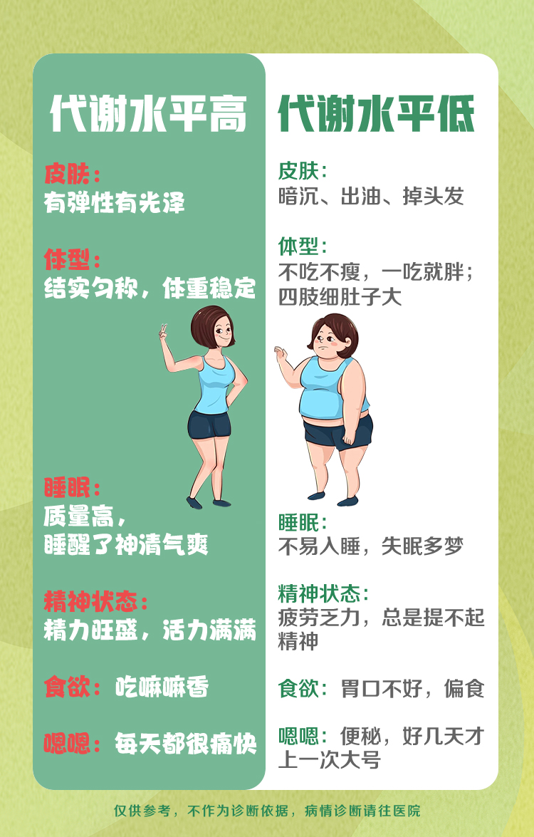 【引导语】减肥遇到瓶颈🤷♂已经吃的很少,运动很多,但是依然很难瘦下去🙉那么可能你进入了“低代谢”的循环🔂代谢水平的高低,可以直接反映在身体上,让我们来对号入座一下吧。
