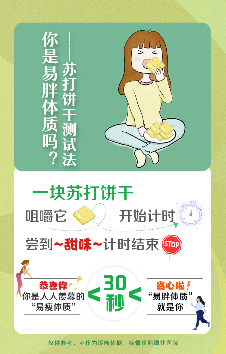 【引导语】宝子们,你是不是也有减肥屡战屡败,少吃不瘦,一吃就胖的烦恼呢🤔忍饥挨饿也不见瘦,那你可能是“易胖体质”。让我们来测试一下吧🔮【趣味小测试】你是易胖体质吗?苏打饼干测试法——
