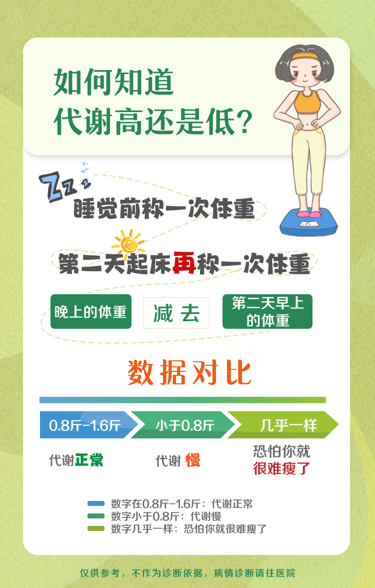 【引导语】✍基础代谢是我们活着就需要消耗的最低代谢值,正常范围在成年人中约为每天1200-2000卡路里。而具体数值取决于个体的年龄、身体质量、性别、身高、体重和活动水平等因素。想知道自己的代谢水平高还是低,睡一觉就知道啦【趣味小测试-代谢水平】