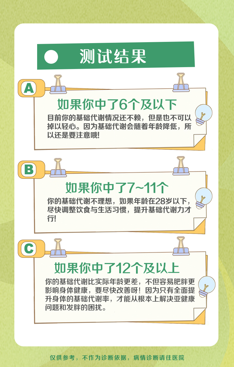 【测试结果】这只是一个简单的小测试,可以帮助我们了解基础代谢♀基础代谢就是我们维持所有器官所需要的最低能量。如果我们的身体进入到“低能耗减排”模式,那可就需要引起注意了。