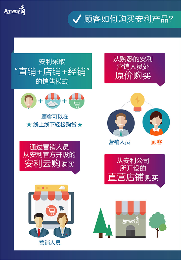 1、安利自创立以来,一直坚持通过销售人员向顾客推销产品的模式。今天即使安利已经成长为跨国企业,在100多个国家和地区开展业务,依然还是坚持“只通过营销人员一个渠道销售产品给顾客”的模式。这是安利的“金科玉律”,是对营销伙伴的一种始终不渝的承诺,也充分说明了这种模式具有强劲的生命力和竞争力。