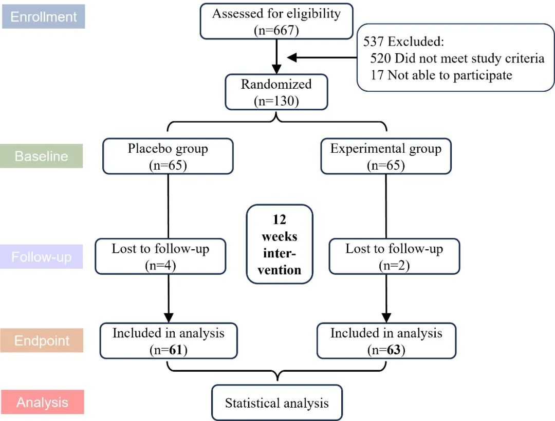 本研究纳入50-70岁被诊断为膝骨关节炎和肌少症的参与者。参与者被随机分配到植物双肽蛋白组或安慰剂组,分别在早餐和午餐后各服用一次,共持续12周。结果显示植物双肽蛋白组的SPPB(简易体能状况量表)、握力、骨骼肌质量指数、骨关节炎指数WOMAC、生活质量评估量表等指标相对于安慰剂组均有所改善。证明了植物双肽蛋白可以缓解伴随肌少症的患有轻度和中度膝骨关节炎的老年人的健康症状,并且这种改善可能归因于肌肉质量、力量和体能的增强。