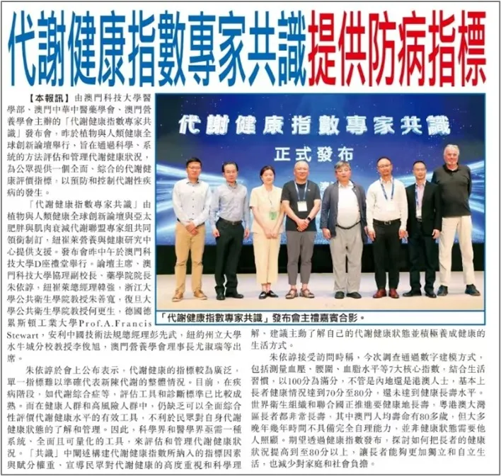 【本报道】由澳门科技大学医学院、澳门中华中医药学会、澳门营养学会主办的《代谢健康指数专家共识》发布会,昨于植物与人类健康全球创新论坛举行,旨在通过科学、系统的方法评估和管理代谢健康状况,为公众提供一个全面、综合的代谢健康评估指标,以预防和控制代谢性疾病的发生。
