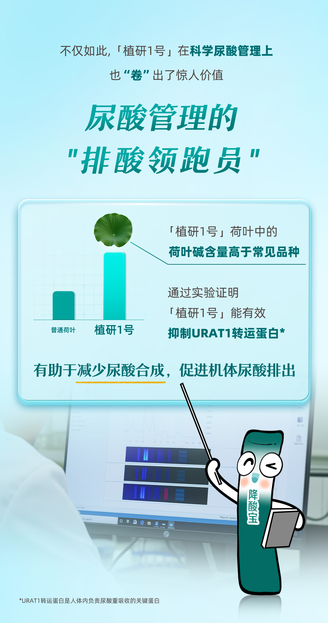 植研一号,作为排酸领域的领头羊,它的实力将通过硬核实验得到验证。欢迎各位来到纽崔莱ABRC的实验室,这正是我们植物新品种植研一号。作为纽崔莱降尿酸明星成分,它在促进尿酸排出方面发挥着重要作用。生物活性测试显示,“植研一号”能够抑制URAT1转运蛋白,从而促进尿酸的排泄。更值得注意的是,当它与菊苣结合时,效果更为显著。经过八年的精心培育,这片荷叶终于可以正式投入使用,为维持尿酸指标的稳定提供保障。