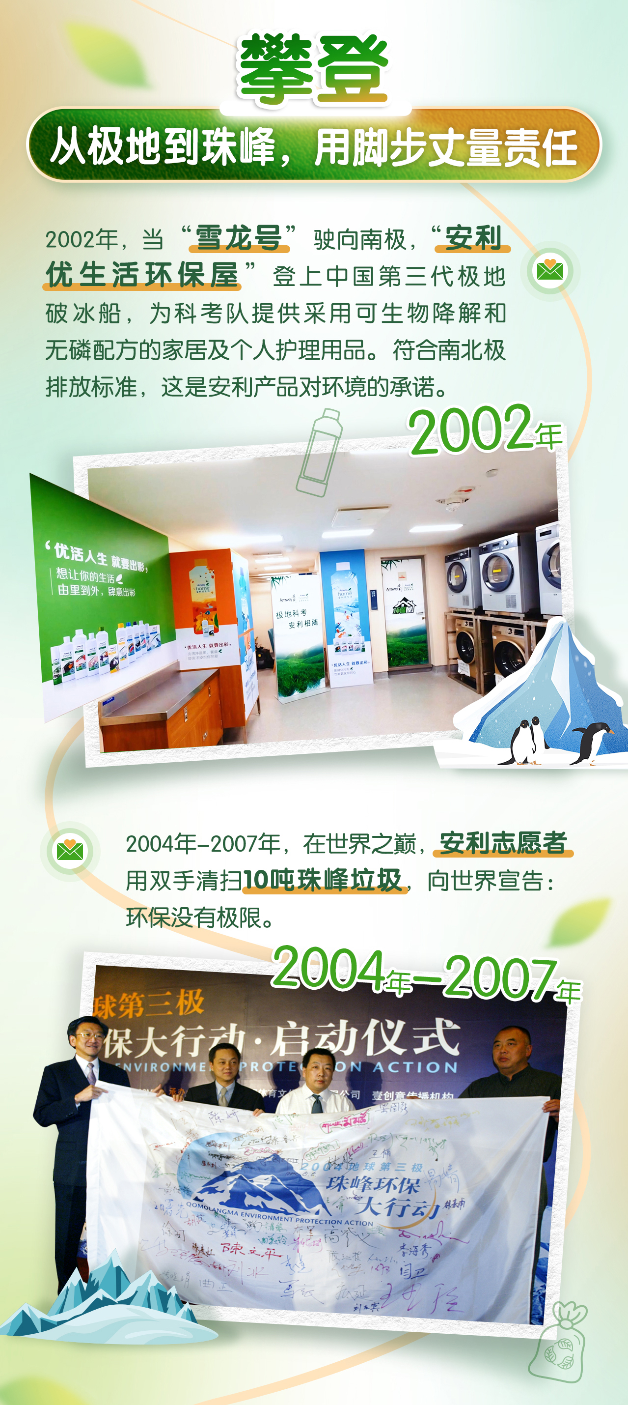 2002年,当“雪龙号”驶向南极,“安利优生活环保屋”登上中国第三代极地破冰船,为科考队提供采用可生物降解和无磷配方的家居及个人护理用品。符合南北极排放标准,这是安利产品对环境的承诺。