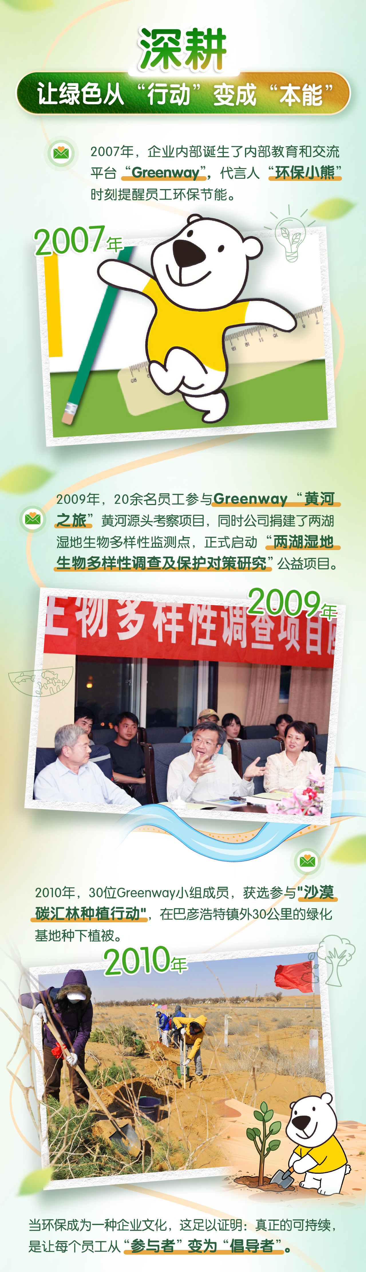 2007年,企业内部诞生了内部教育和交流平台“Greenway”,代言人“环保小熊”时刻提醒员工环保节能。