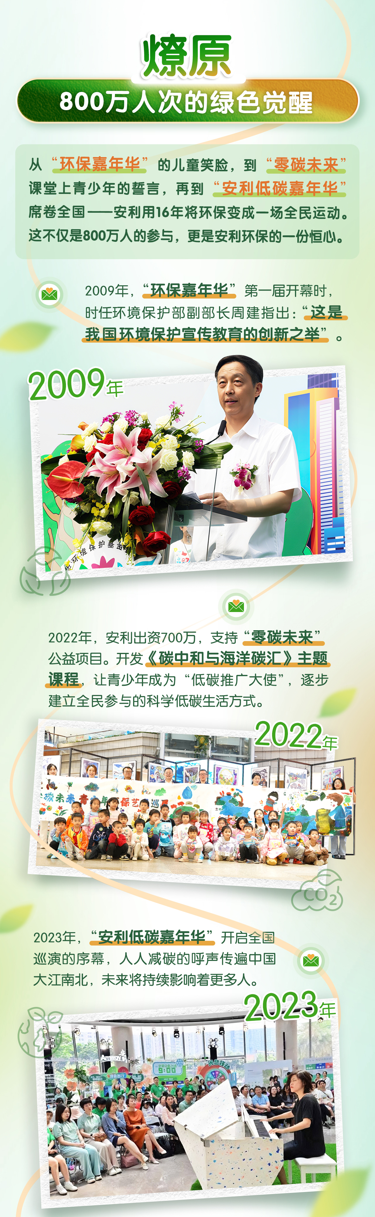 从“环保嘉年华”的儿童笑脸,到“零碳未来”课堂上青少年的誓言,再到“安利低碳嘉年华”席卷全国——安利用16年将环保变成一场全民运动。这不仅是800万人的参与,更是安利环保的一份恒心。
