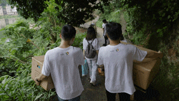 当然这样的闷热抵不住志愿者们对孩子们纯真笑容的期待,大家分工明确把物资送到小朋友的家庭中。