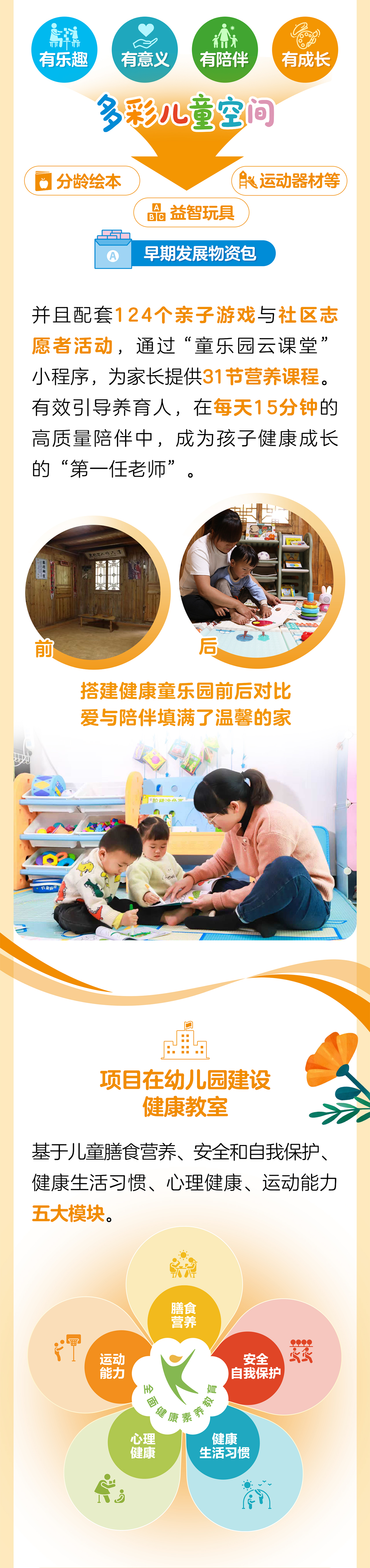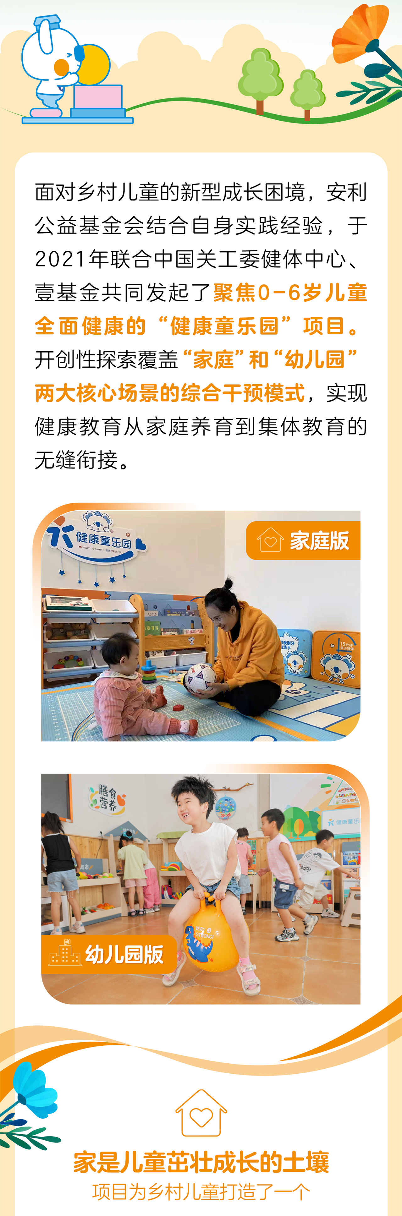 健康童乐园,安利公益王牌,让乡村儿童赢在健康起跑线!安利公益基金,养育能力欠缺,儿童沉迷手机垃圾食品,会当人口高质量发展成为国家重要战略,乡村儿童的成长困境发生转变。安利继续与时代同行,2021年,安利公益基金会联合中国关工委健体中心,壹基金发起聚焦0~6岁儿童全面健康的健康同乐园项目,创新打造覆盖家庭和幼儿园两大核心场景的综合干预模式,全面支持儿童、家长、教师三大人群,实现从家庭养育到集体教育的无缝衔接。项目为乡村家庭提供早期发展物资包配套、亲子游戏、营养课程等养育支持,通过每天15分钟高质量陪伴,让家长成为孩子成长的重要责任人。同时,项目在幼儿园建设健康教室,研发儿童需掌握的健康知识点,制定教师培训方案,赋能乡村幼儿园教师的健康教学能力,为改善乡村儿童发展滞后问题提供了全面的解决方案。创新专业的项目模式,获得政府领导、专家、名人、公众的认可,儿童全面健康事业的队伍不断壮大,健康同乐园正逐渐成为儿童全面健康领域的标杆性品牌。如今,项目正向着多方合作,守护儿童健康成长的价值,共创品牌迈进,不断深化与政府机构、企业、社区的合作,共同助力乡村振兴与人口发展。立足中国30载安利,始终以公益创新弥合社会健康差距,凝聚各界力量,共筑人口高质量发展根基,让健康童年照亮民族未来,给中国乡村儿童一个充满乐趣、关爱和健康的童年。