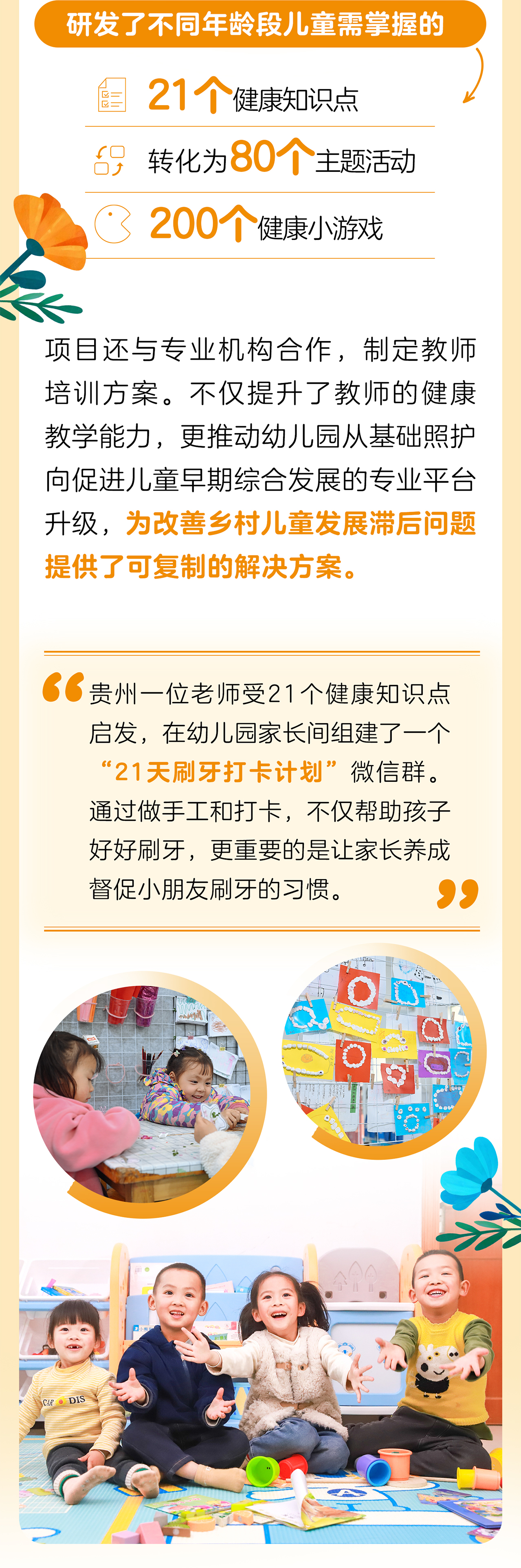 项目还与专业机构合作,制定教师培训方案。不仅提升了教师的健康教学能力,更推动幼儿园从基础照护向促进儿童早期综合发展的专业平台升级,为改善乡村儿童发展滞后问题提供了可复制的解决方案。