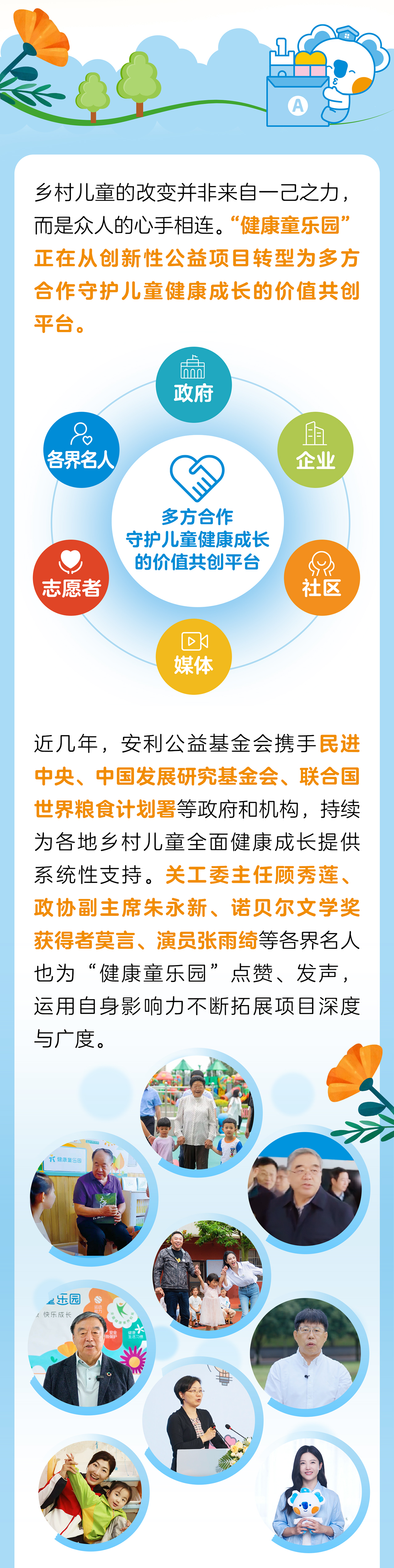 近几年,安利公益基金会携手民进中央、中国发展研究基金会、联合国世界粮食计划署等政府和机构,持续为各地乡村儿童全面健康成长提供系统性支持。关工委主任顾秀莲、政协副主席朱永新、诺贝尔文学奖获得者莫言、演员张雨绮等各界名人也为“健康童乐园”点赞、发声,运用自身影响力不断拓展项目深度与广度。