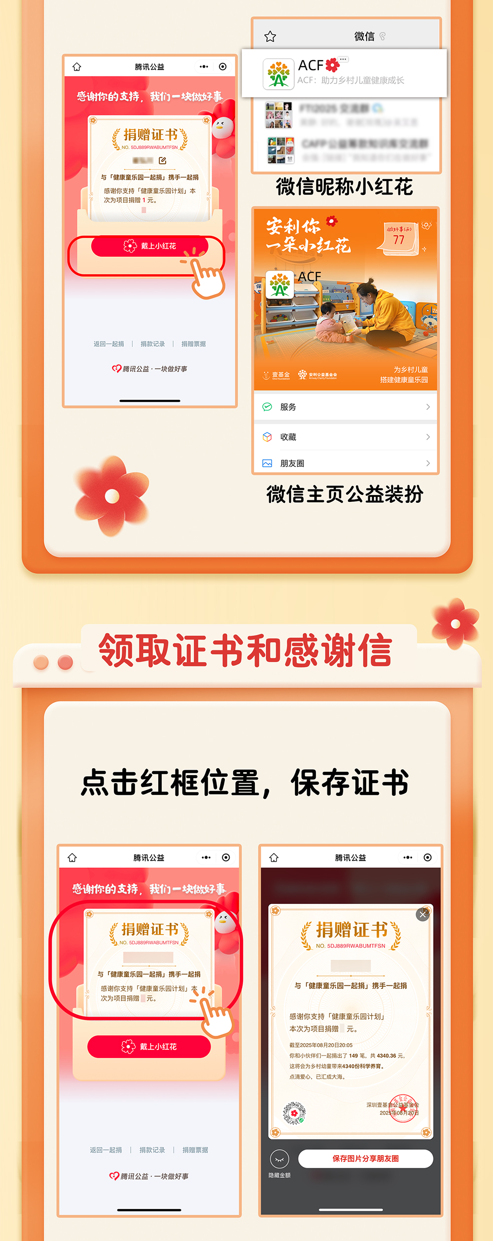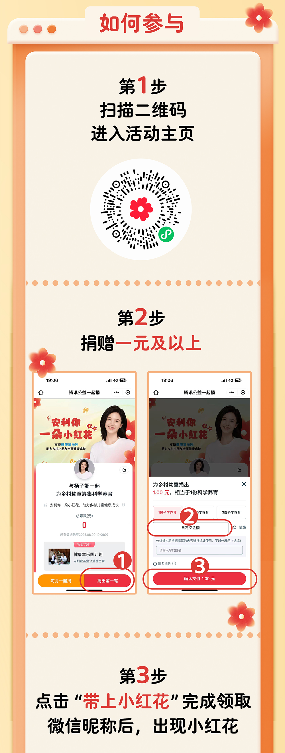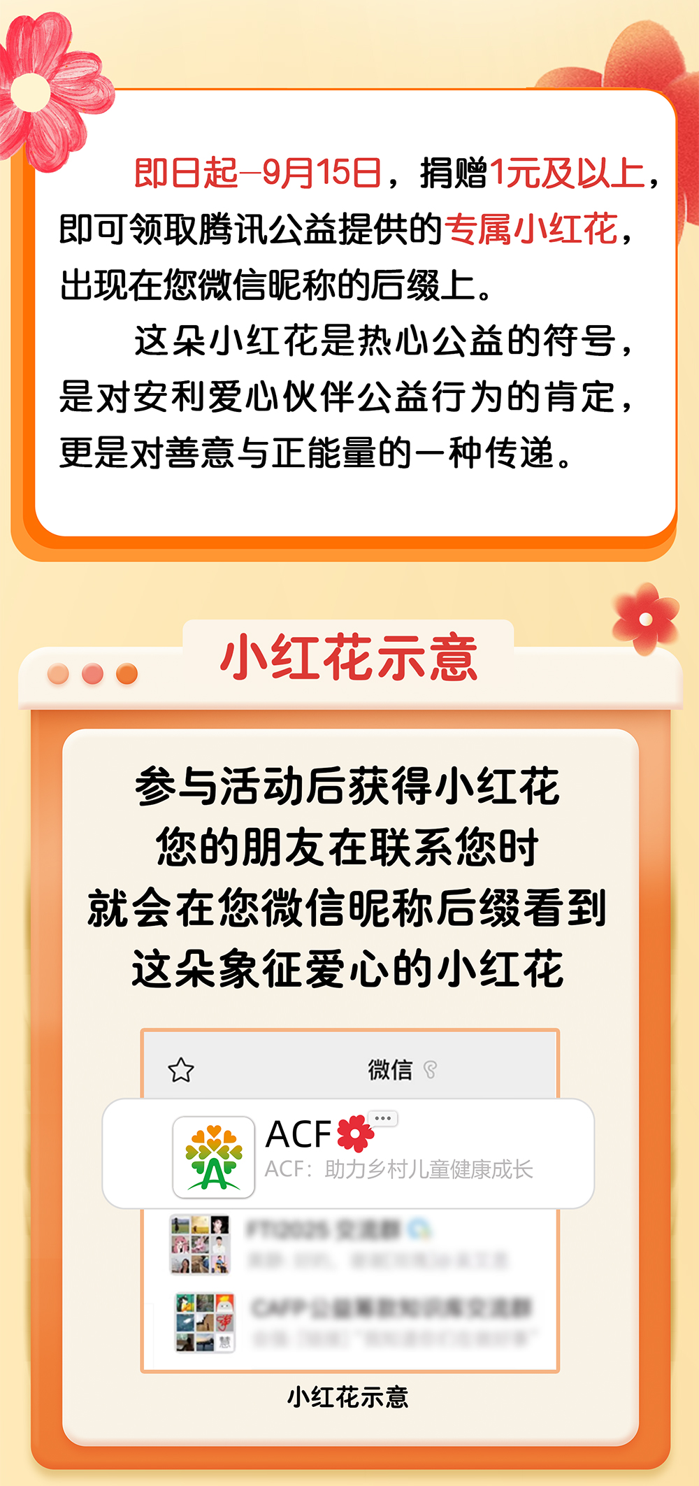 即日起-9月15日,捐赠1元及以上,即可领取腾讯公益提供的专属小红花,出现在您微信昵称的后缀上。