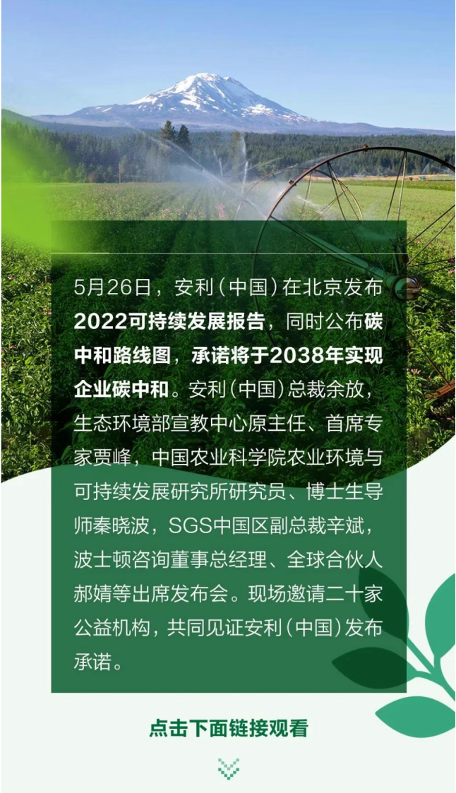 5月26日,安利(中国)在北京发布2022可持续发展报告,同时公布碳中和路线图,承诺将于2038年实现企业碳中和。安利(中国)总裁余放,生态环境部宣教中心原主任、首席专家贾峰,中国农业科学院农业环境与可持续发展研究所研究员、博士生导师秦晓波,SGS中国区副总裁辛斌,波士顿咨询董事总经理、全球合伙人郝婧等出席发布会。现场邀请二十家公益机构,共同见证安利(中国)发布承诺。
