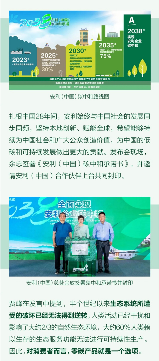 扎根中国28年间,安利始终与中国社会的发展同步同频,坚持本地创新、赋能全球,希望能够持续为中国社会和广大公众创造价值,为中国的低碳和可持续发展做出更大的贡献。发布会现场, 余总签署《安利(中国)碳中和承诺书》,并邀请安利(中国)合作伙伴上台共同封印。