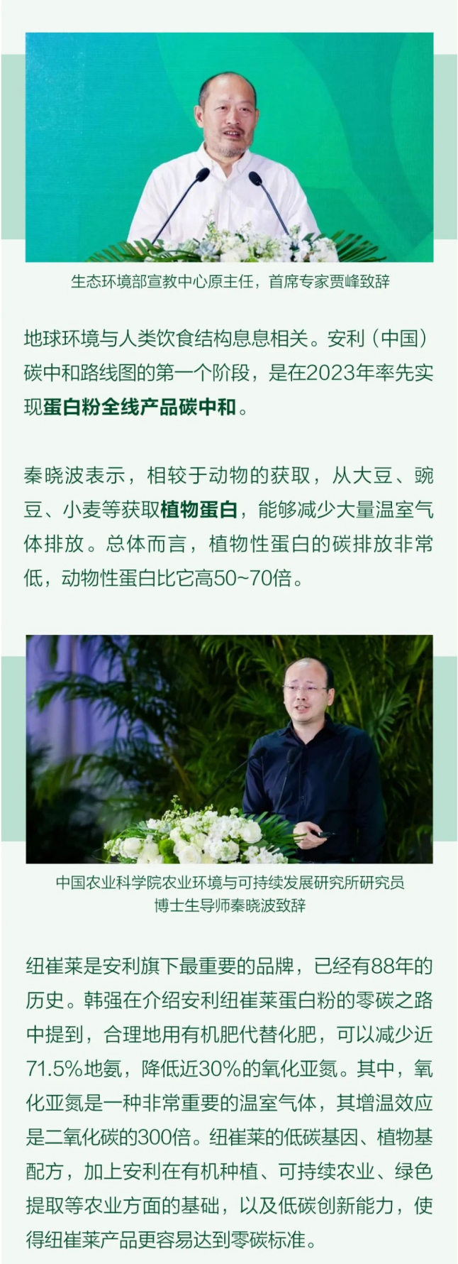 响应国家可持续发展战略的号召,助力实现中国3060碳中和目标,安利中国于2023年5月26日在北京成功举办可持续发展报告发布会。安利中国总裁余放、社会各界专家及安利管理层出席了此次发布会。现场邀请了20家公益机构共同见证安利中国发布承诺。在此,我代表安利公司向全社会承诺,我们致力于在2038年实现安利中国的企业碳中和目标,为助力中国实现双碳目标贡献我们的力量。在发布会现场,余总签署安利中国碳中和承诺书,并邀请安利中国合作伙伴上台共同封印承诺书。作为安利碳中和目标实施的第一步,安利纽崔莱八款蛋白粉产品同日宣布实现全线碳中和。零碳的新产品在某种程度上为消费者提供了选择,通过这样的选择,个人的碳足迹得以减少,对未来人类达成更好的目标发挥更大的、更快的作用。目前我国的气体排放,畜牧业的排放大于种植业,动物性产品总体比植物性产品高得多,大概高50到70倍。因此,植物性蛋白的碳排放非常低。研究发现,合理使用有机肥替代化肥,可以减少氨挥发近71.5%,一氧化亚氮排放近30%。氧化亚氮是一种重要的温室气体,其增温效应是二氧化碳的300倍。凭借我们的低碳基因、在农业上形成的基础以及农业的低碳创新能力,使得纽崔莱产品更容易实现零碳排放。我们发现纽崔莱在整个生产链上都是绿色可持续的。更让我感动的是,绿色环保理念从企业创办开始就深深地植根在了企业的基因里。可以说,我真切地感受到了安利纽崔莱对绿色可持续的追求和坚守,对人与自然和谐共生的探索的贡献。零碳好蛋白,自然更健康。安利纽崔莱蛋白粉全线产品获得SGS碳中和认证,成为中国首款零碳蛋白粉,从自然中获取植物营养素,在守护健康的同时,和大家一起守护我们的地球。