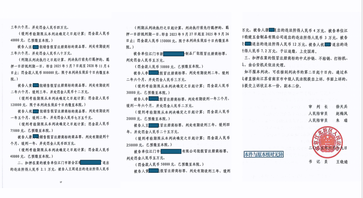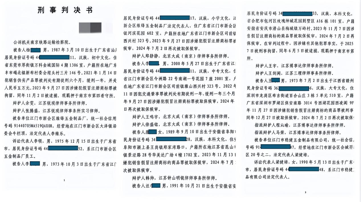 2025年6月19日,南京江北新区人民法院依法对该案作出一审判决。根据一审判决书显示,被告人汪某犯销售假冒注册商标的商品罪,判处有期徒刑三年六个月,并处罚金人民币八十万元;被告人黄某犯销售假冒注册商标的商品罪,判处有期徒刑二年六个月,缓刑三年,并处罚金人民币十二万元;被告人祝某犯销售假冒注册商标的商品罪,判处有期徒刑一年五个月,缓刑二年,并处罚金人民币七万五千元。其余涉案人员也受到了不同程度的处罚。这些判决体现了法律对制假售假行为的严厉打击,也彰显了安利公司维护品牌和消费者权益的决心。