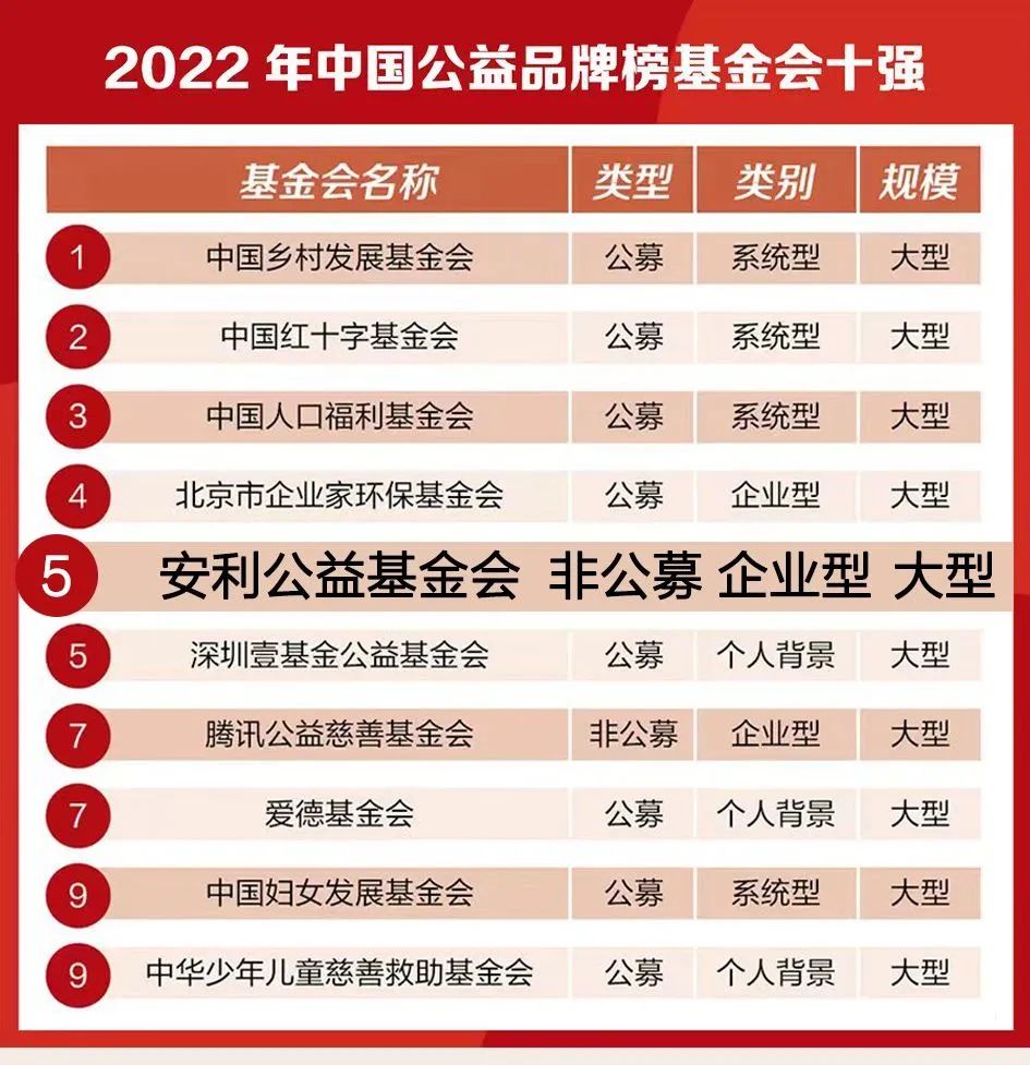 近日,由权威媒体《南方周末》主办的“2022筑梦者公益大会”在北京线上举行,活动现场,安利公益基金会荣登“2022年度中国公益品牌榜基金会十强”!这是我们首次登上这份榜单,位列前茅的荣誉,代表了我们在儿童健康领域长期持续投入的一份肯定。深耕公益,我们是认真的,而这份认真让我们收获了更多的认可和并肩而行的伙伴。