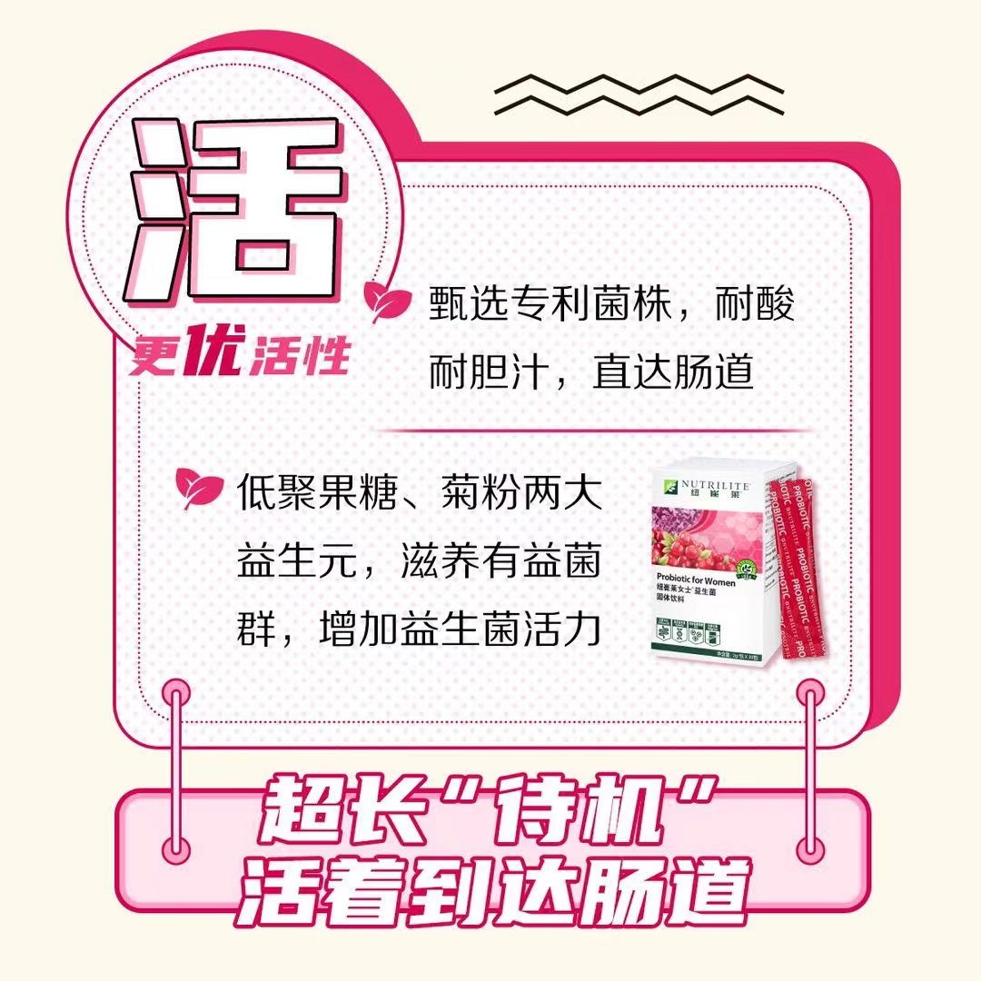 说到“活”,因为益生菌被摄入后首先要经过胃,胃酸的酸性较强,如果它不能活着到达肠道,就不能最好的发挥作用。这就需要研究人员在研发之初选定符合标准的菌种、菌量。而纽崔莱益生菌固体饮料,从全球上千菌库甄选耐胃酸、耐胆汁的专利菌株,而且还添加了低聚果糖和菊粉两种益生元,可以滋养菌群,让益生菌更有活力。