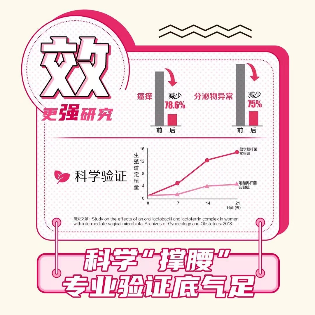 研究文献: Study on the effects of an oral lactobacilli and lactoferrin complex in women with intermediate vaginal microbiota. Archives of Gynecology and Obstetrics. 2018