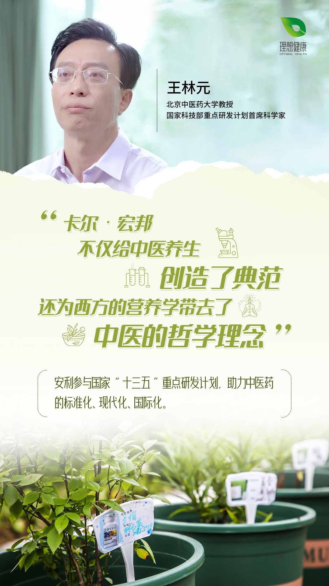 北京中医药大学教授王林元认为,卡尔•宏邦为中医带来了西医的科学和精准,又为西医带去了中医的哲学理念,从而把纽崔莱打造成了中西养生结合的最佳范本,而且秉承着卡尔•宏邦理念的纽崔莱还在中医药国际化、现代化、规范化上做出了突出的贡献。