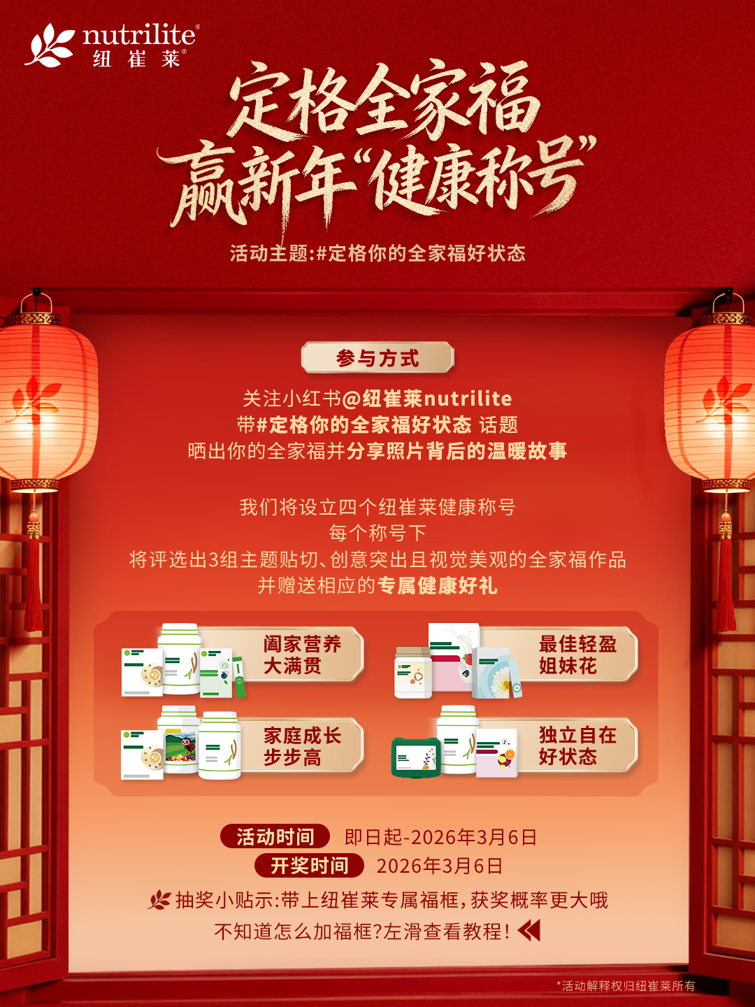 我们将设立四个纽崔莱健康称号。每个称号下,将评选出3组主题贴切、创意突出且视觉美观的全家福作品,并赠送相应的专属健康好礼。
