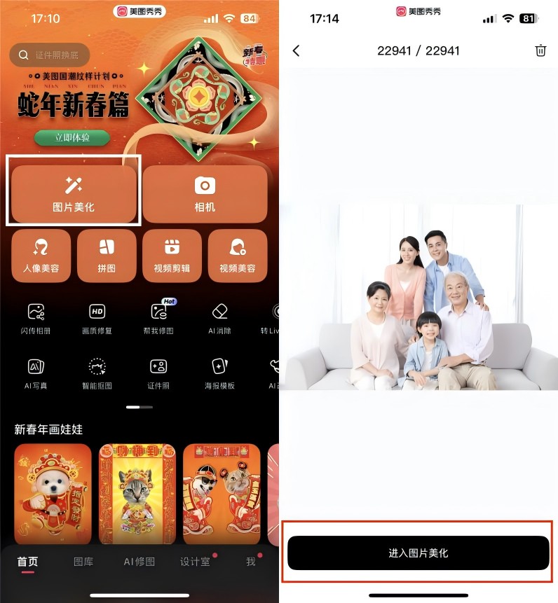 第二步:打开美图秀秀,点击【图片美化】,从相册中选取一张您喜欢的个人或者全家照片,点击【进入图片美化】。