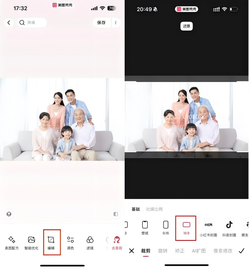 第三步:点击下方【编辑】选项,将照片裁剪为【16:9】,点击√保存。