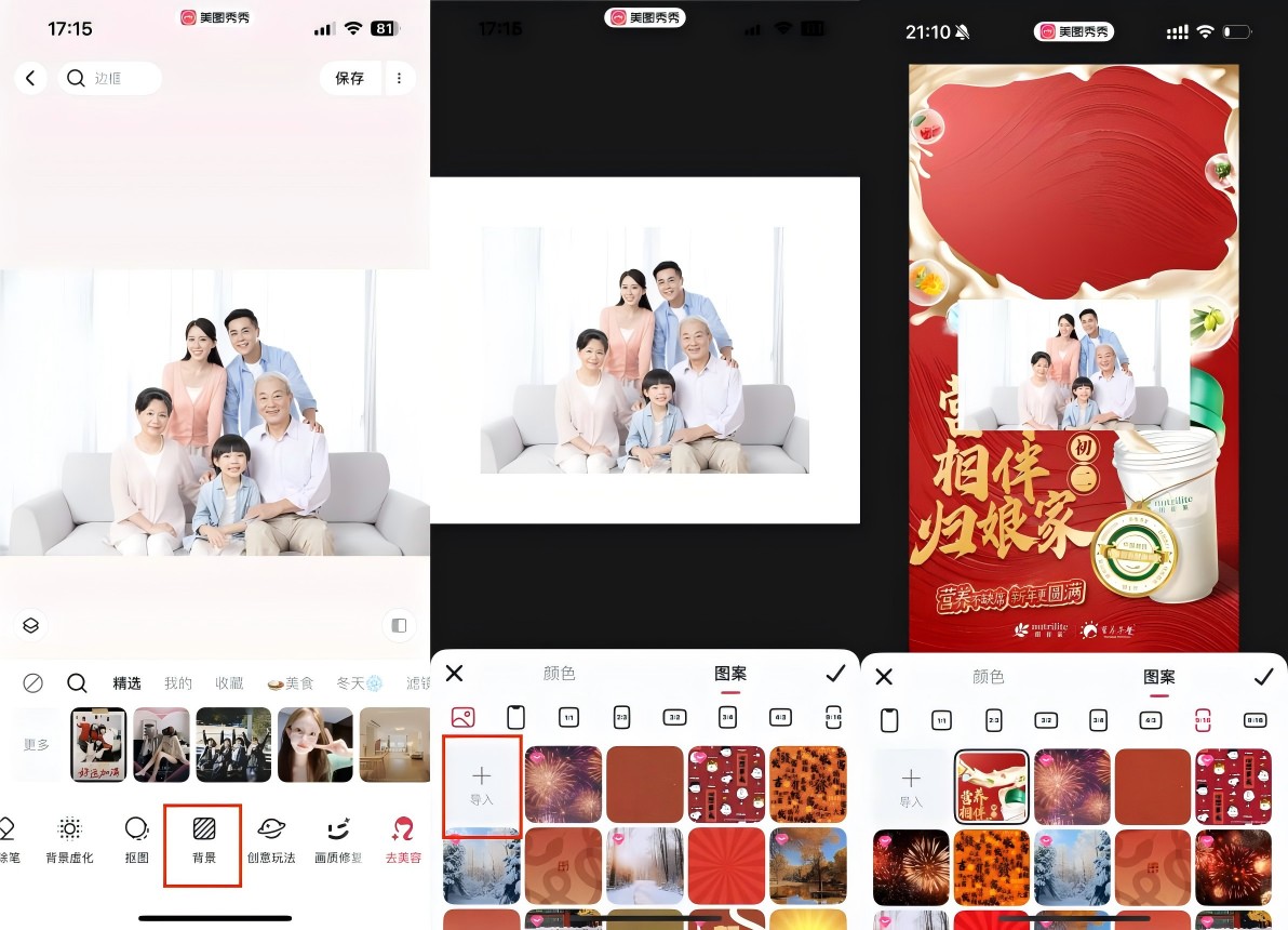 第四步:点击下方【背景】选项,点击【导入】,选择已保存在相册的【新春拜年海报】模板,并选择尺寸为【9:16】。