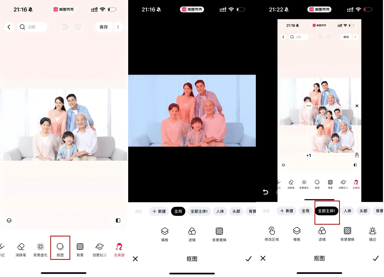 第三步:滑动下方导航条,点击【扣图】选项,将自动进入扣图,点击【全部主体1】将出现自动扣好的人像。