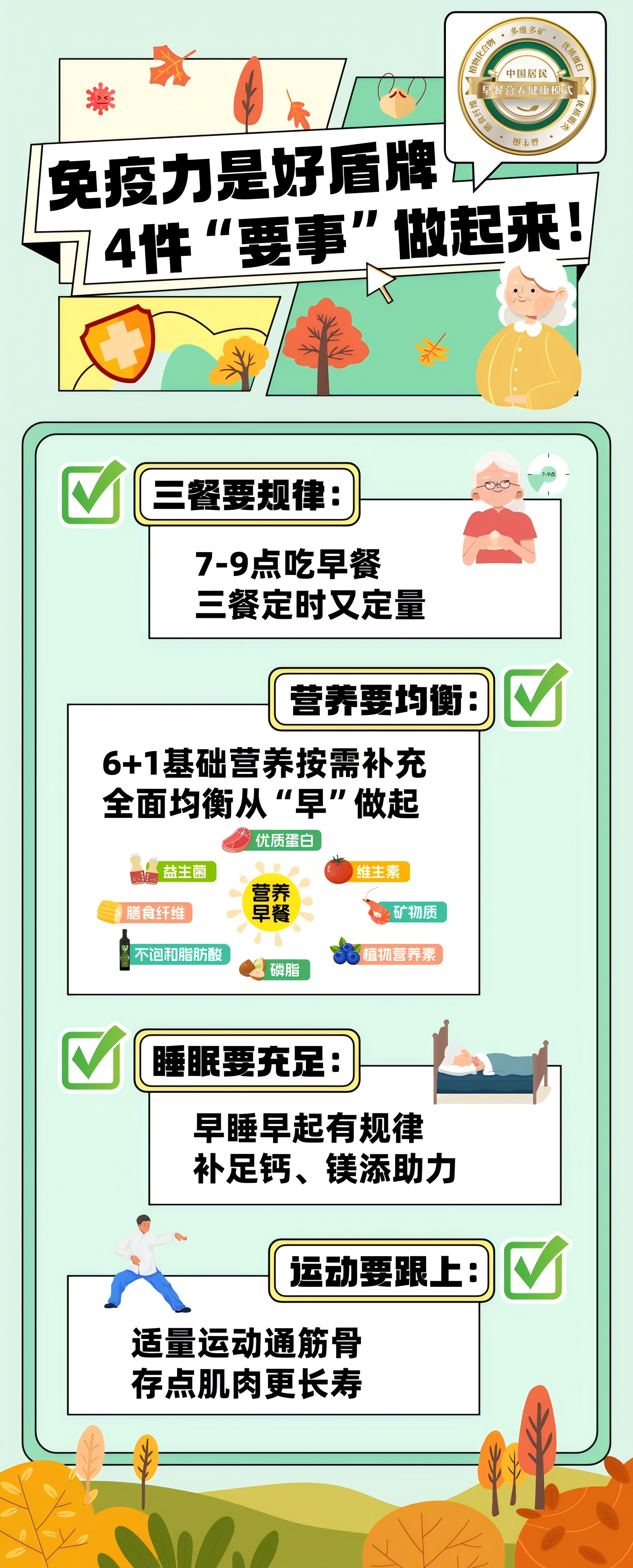 除了以上“四要”“三不要”,在日常生活中,还可根据身体所需,把握好早餐这一营养摄取的紧要窗口,适当补充各种不同的营养元素,让免疫力跟上节奏,让健康“延迟退休”!