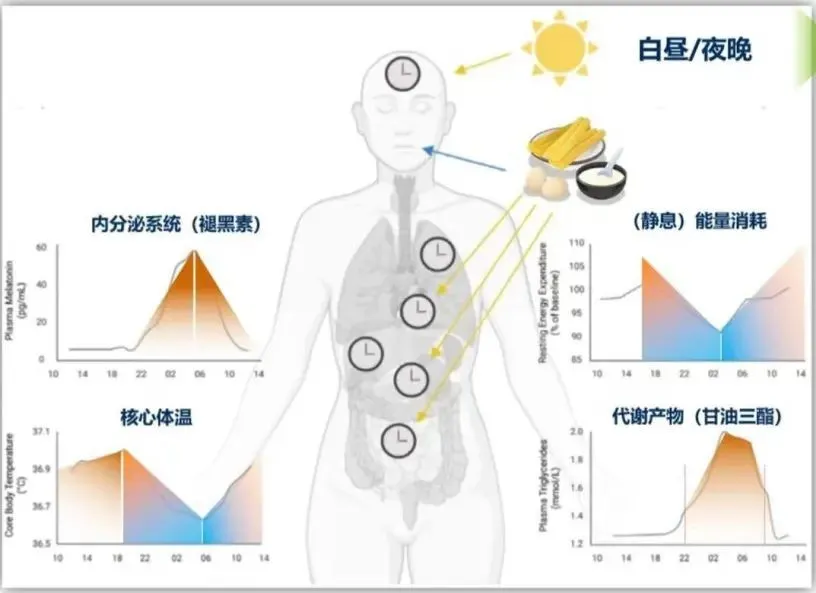 现在营养学里面还有一个新的概念叫做时间营养学。就是讲究环境钟,生物钟,饮食钟要三钟合一。第一个钟就是遵循自然光照变化,白昼和夜晚,我们把它叫做环境钟;其次就是人体的生物钟,我们有中枢生物钟,还有各个五脏六腑的器官生物钟;另外,还有一个钟,就是我们吃饭的饮食钟。