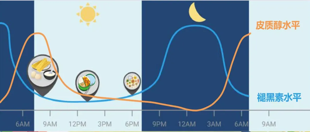 蓝色代表的是褪黑素的水平,晚上会升高、早晨会下降;橘色代表皮质醇的水平,这个激素可以和大家将要应对一天的压力联系起来。早上起来之后,皮质醇的水平是很高的,就是要告诉你准备应对接下来充满挑战的一天。这个时候若正常的吃早餐,吃完早餐后,皮质醇水平就会慢慢的下降到一个比较平稳的状态。如果你不吃,早上的节奏又很快,那么你一整天就会处于一个高压的状态。长期对健康影响是非常大的。