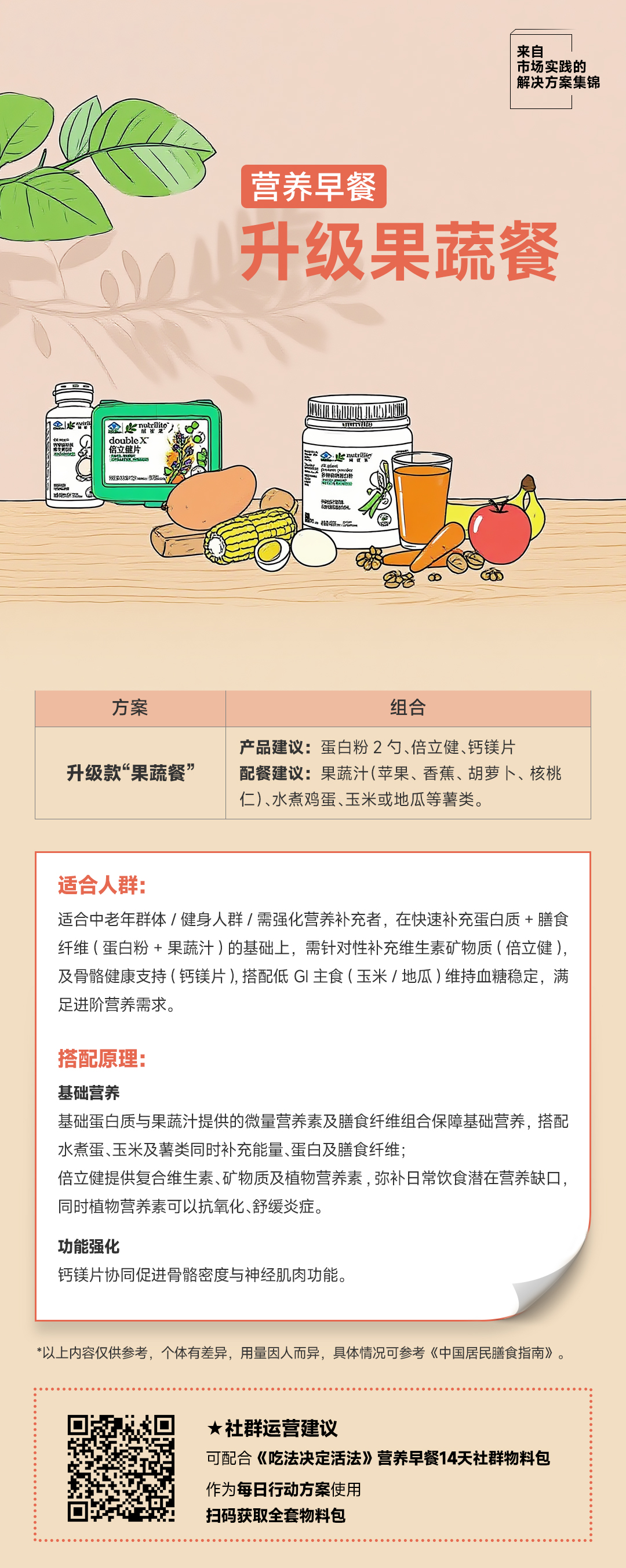 适合人群:适合中老年群体 / 健身人群 / 需强化营养补充者,在快速补充蛋白质 + 膳食纤维(蛋白粉 + 果蔬汁)的基础上,需针对性补充维生素矿物质(倍立健),及骨骼健康支持(钙镁片),搭配低 GI 主食(玉米 / 地瓜)维持血糖稳定,满足进阶营养需求。