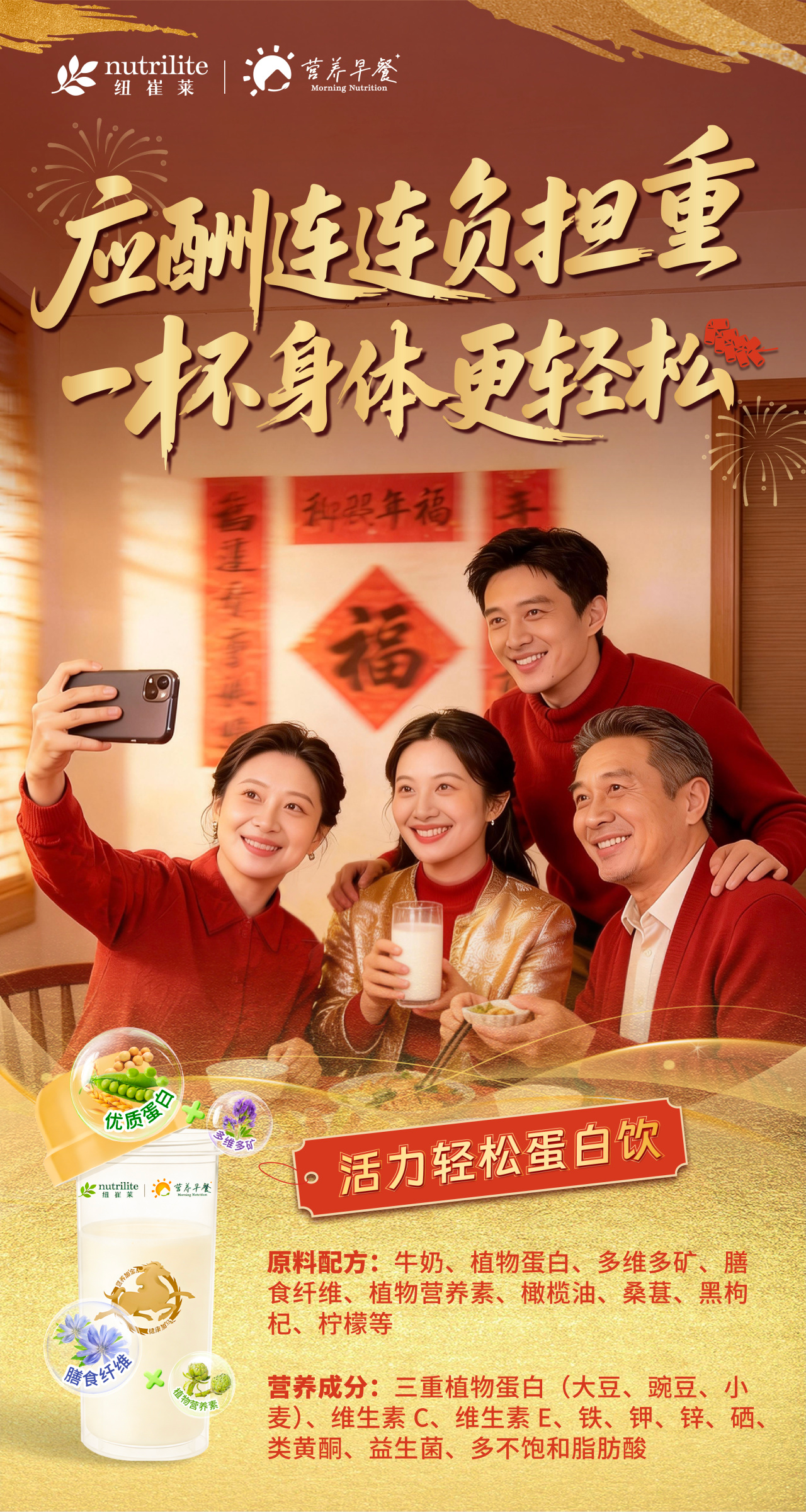2大核心:复合碳水+植物蛋白提供持久能量,精神饱满过好年;多维多矿(含镁、B族维生素)帮您舒缓工作压力;