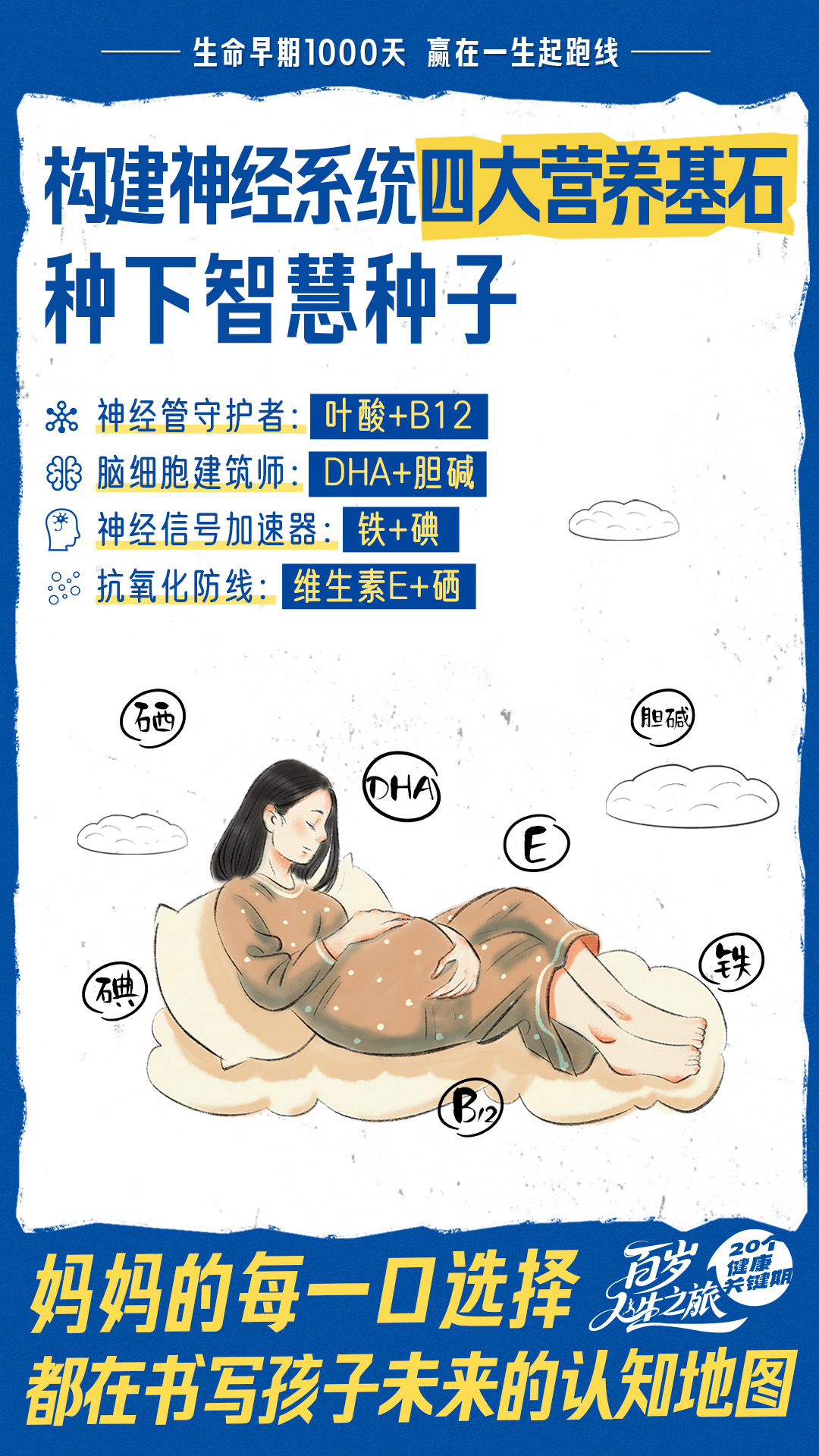 2 胎儿神经发育依赖四大营养基石: 叶酸 + B12、DHA + 胆碱、铁 + 碘、维生素E + 硒。
