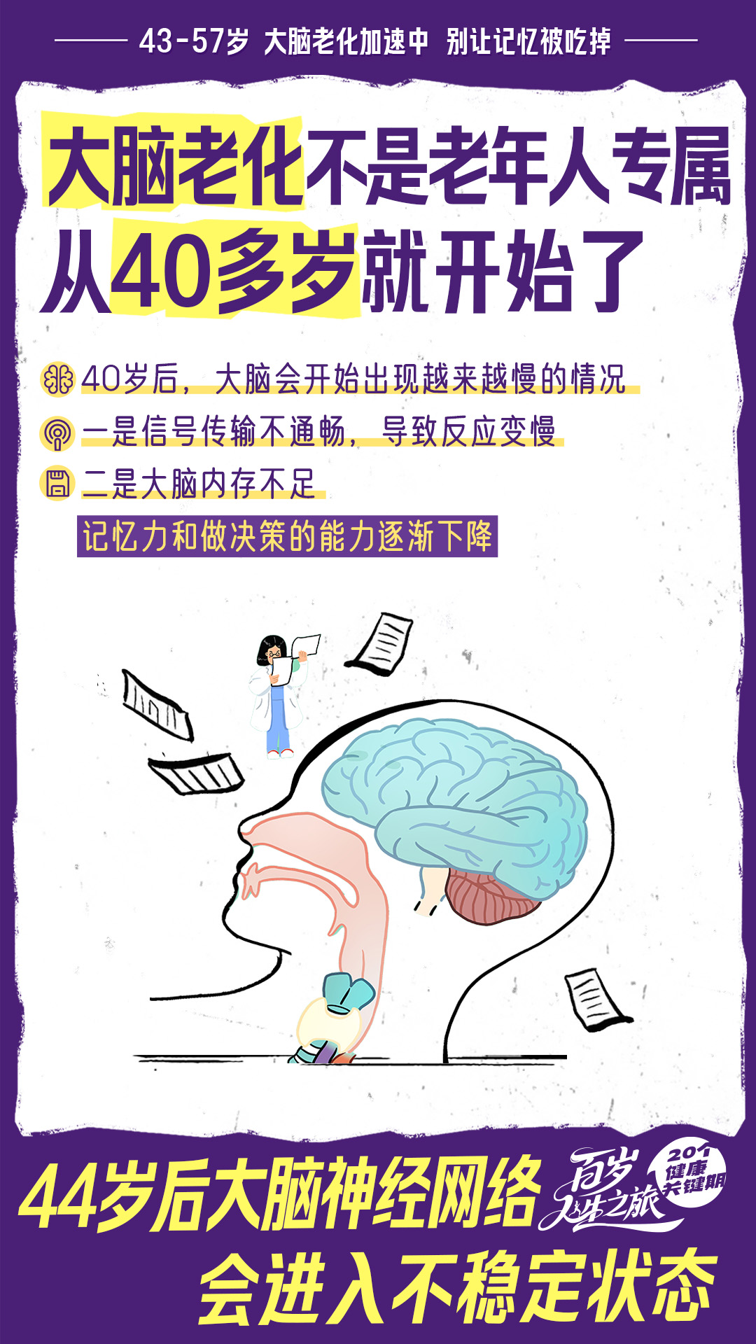 人不是老了才变糊涂的,在 44 岁、57 岁,大脑功能会出现“断崖式衰老”,如果不注意养护,可能就会变成反应迟钝、记性差、难沟通的老糊涂,最终甚至引发大脑功能衰退,导致老年痴呆。40 岁开始,就需要优化大脑,为有质量的晚年打好基础。