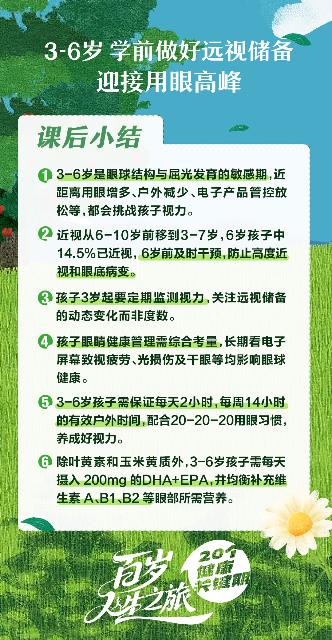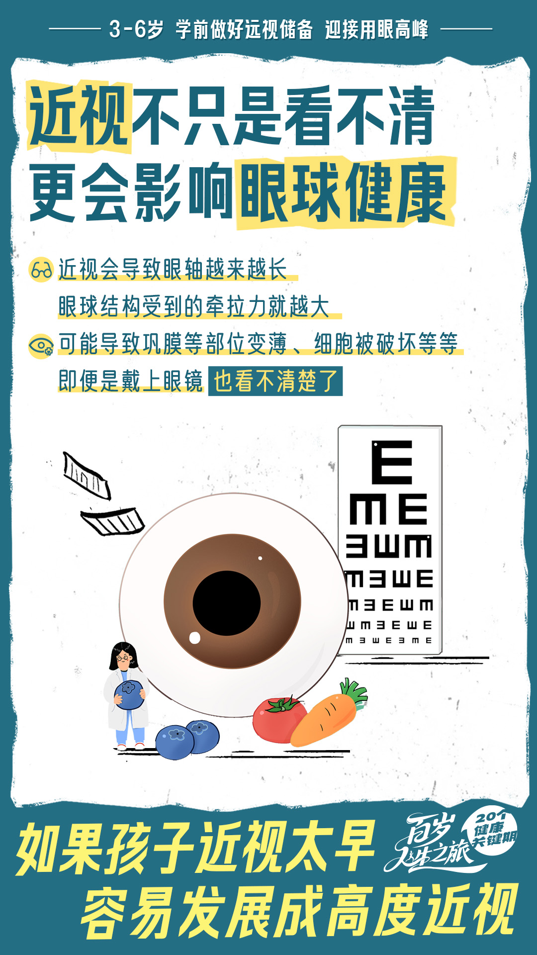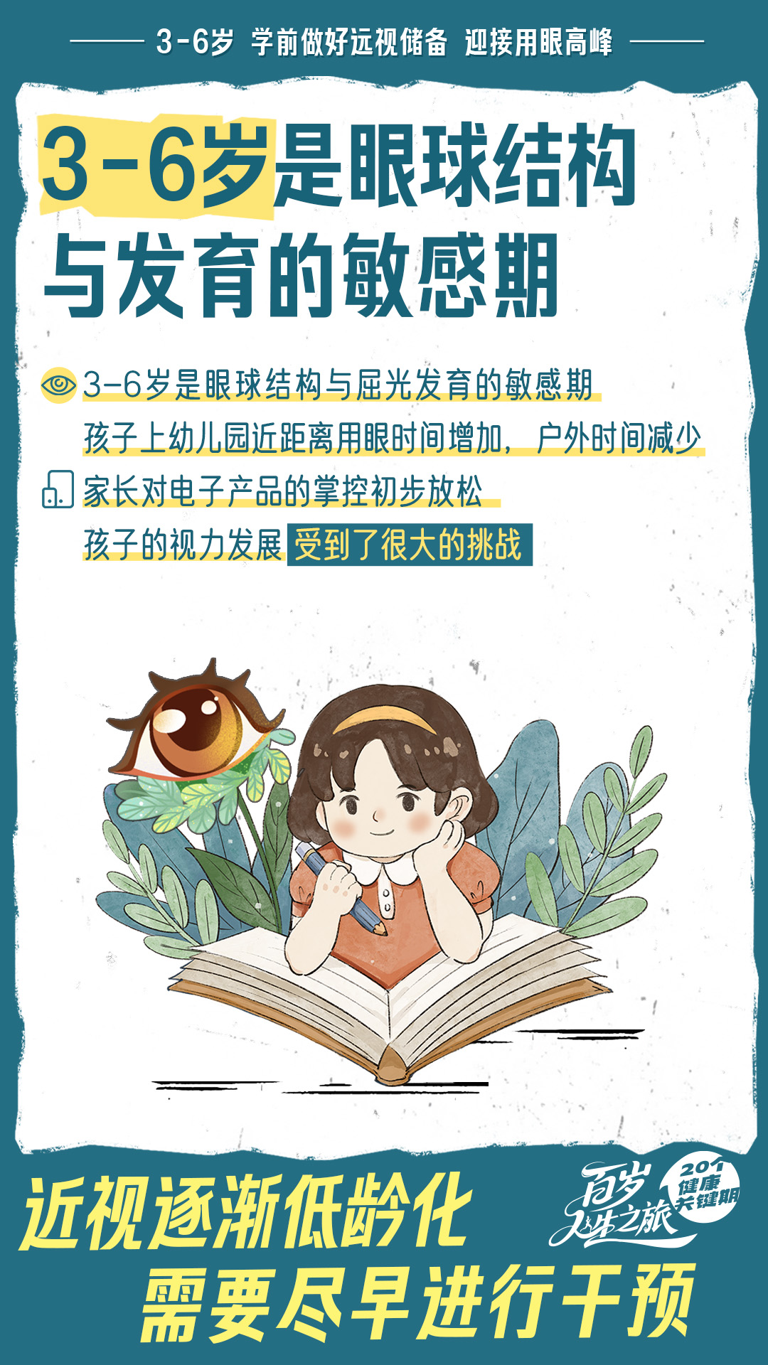 1 3-6岁是眼球结构与屈光发育的敏感期,近距离用眼增多、户外减少、电子产品管控放松等,都会挑战孩子视力。