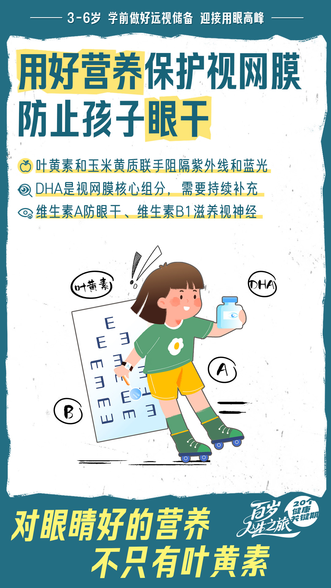 6 除叶黄素和玉米黄质外,3-6岁孩子需每天摄入 200mg 的DHA+EPA,并均衡补充维生素 A、B1、B2 等眼部所需营养。