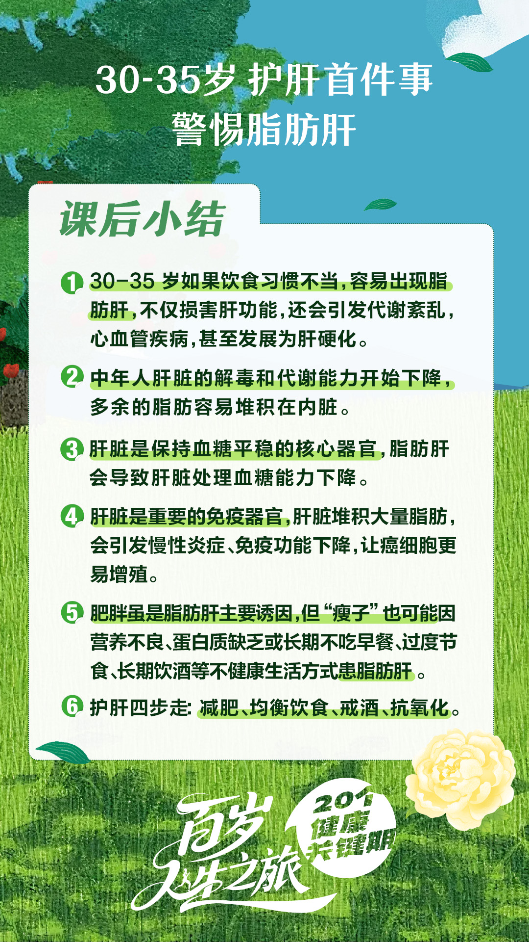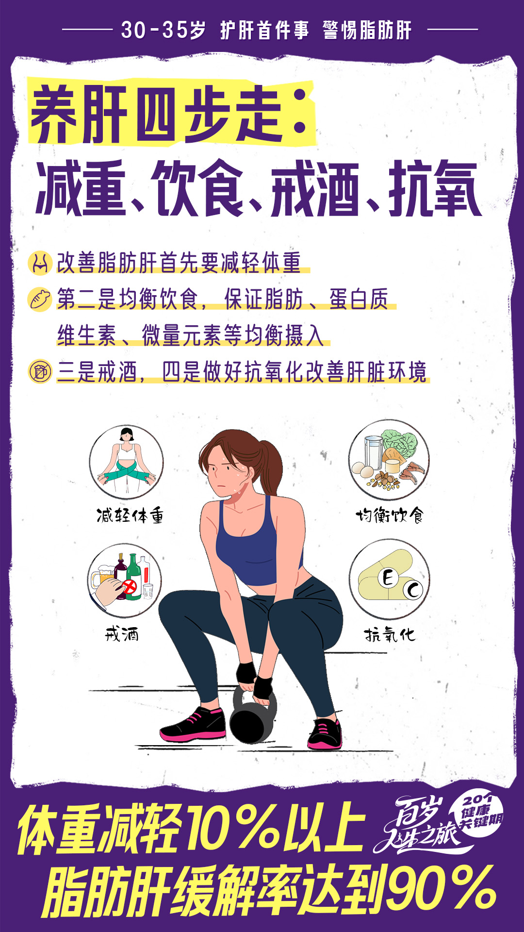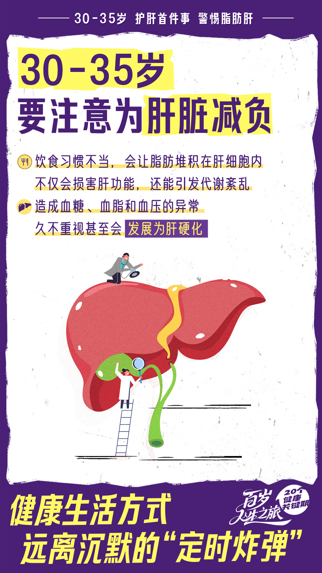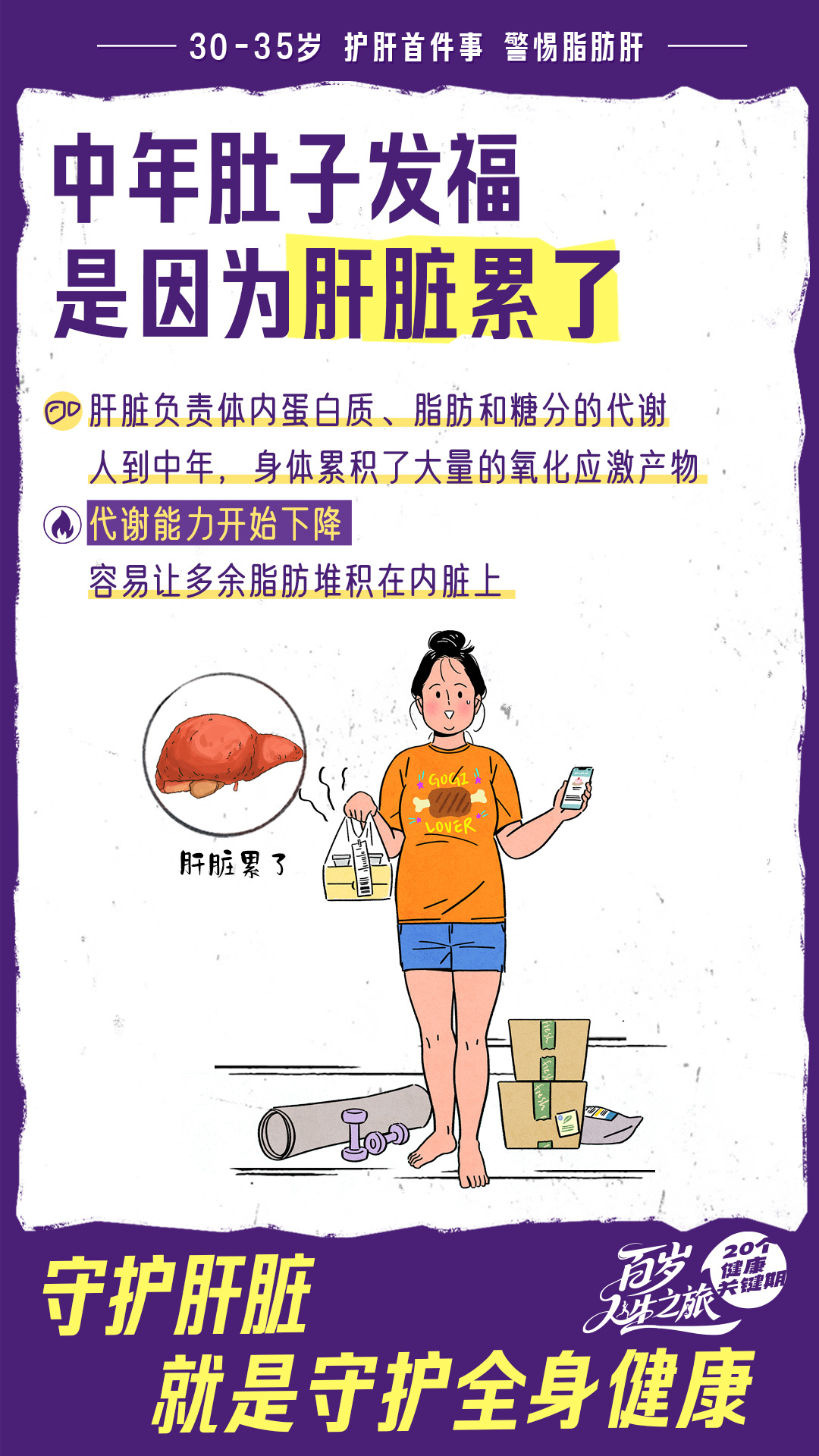 到了 30 岁,如果饮食习惯不当,容易出现一个“静悄悄”的健康隐患,就是内脏脂肪过高——脂肪肝。肝脏内大量堆积脂肪,不但会损害肝功能,还会引发代谢紊乱、增加心血管疾病风险,甚至会发展成肝硬化。30-35 岁,一定要把肝脏调理好,远离脂肪肝威胁。