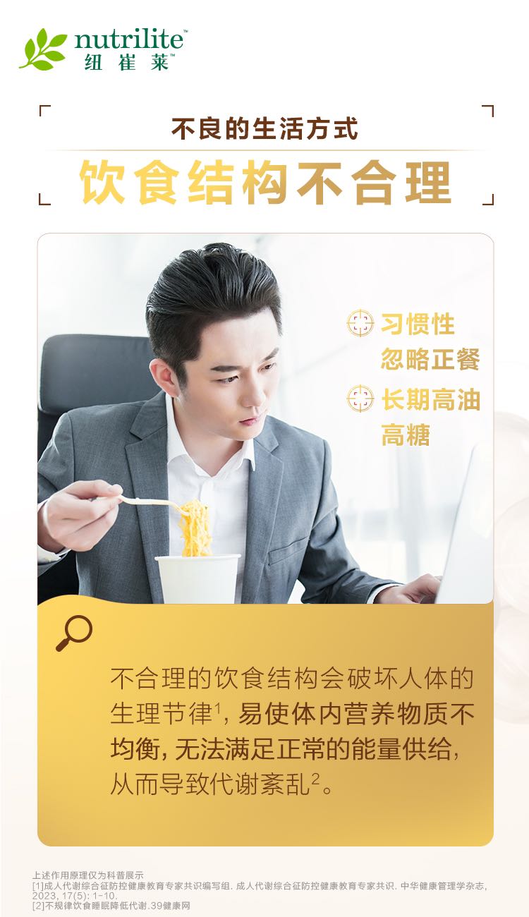 代谢紊乱是如何引起的呢?引发代谢紊乱的原因是多方面的其中不良的生活方式是代谢紊乱的重要原因🍳不良的生活方式1:饮食结构不合理🌾不合理的饮食结构会破坏人体的生理节律,易使体内营养物质不均衡,无法满足正常的能量供给,从而导致代谢紊乱