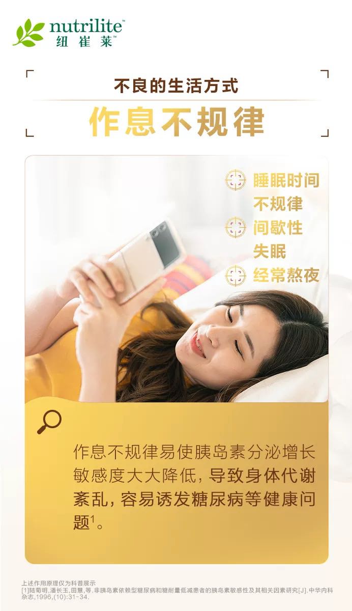 💤不良的生活方式3:作息不规律🔔作息不规律易使胰岛素分泌增长,敏感度大大降低,导致身体代谢紊乱,容易诱发糖尿病等健康问题