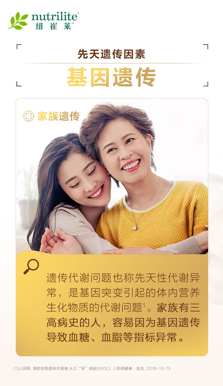 除了不良的生活方式先天遗传因素也有可能造成代谢紊乱🧬先天遗传因素:基因遗传👥遗传代谢问题也称先天性代谢异常,是基因突变引起的体内营养生化物质的代谢问题。家族中有三病史的人,容易因为基因遗传导致血糖、血脂等指标异常